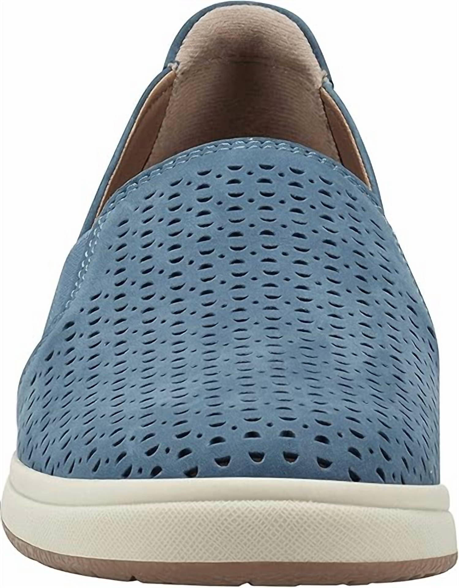 When fashion and function come together seamlessly. Slip into effortless style with the Women's Elin Leather Slip-on Casual Sneakers by EARTH. Crafted from premium leather, these sneakers are designed in a chic Parisian Blue shade with laser-cut perforations for sandal-like ventilation. The soft, moisture-wicking footbed cover is crafted from 82% recycled plastic bottles, offering both sustainability and comfort. Enjoy the hidden stretch materials and cushioned, memory foam, arch-supporting footbed, all rounded out in a contemporary round toe design.