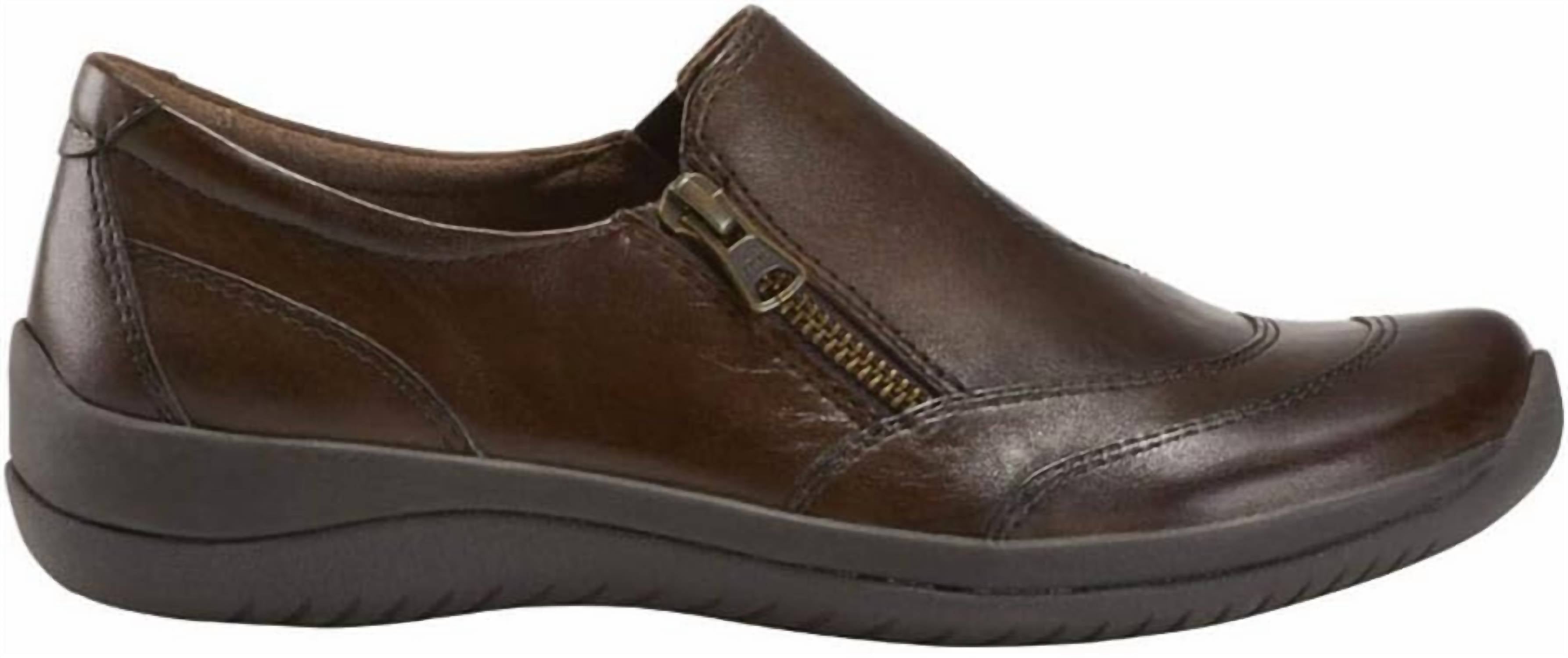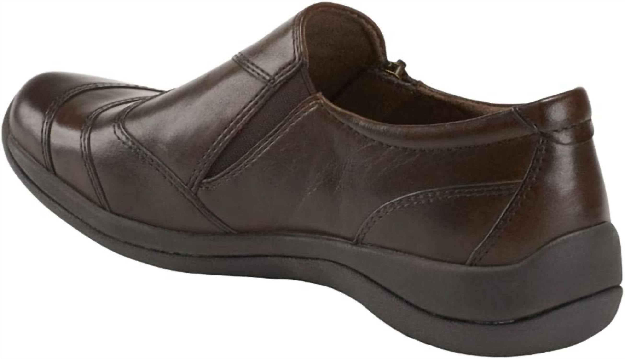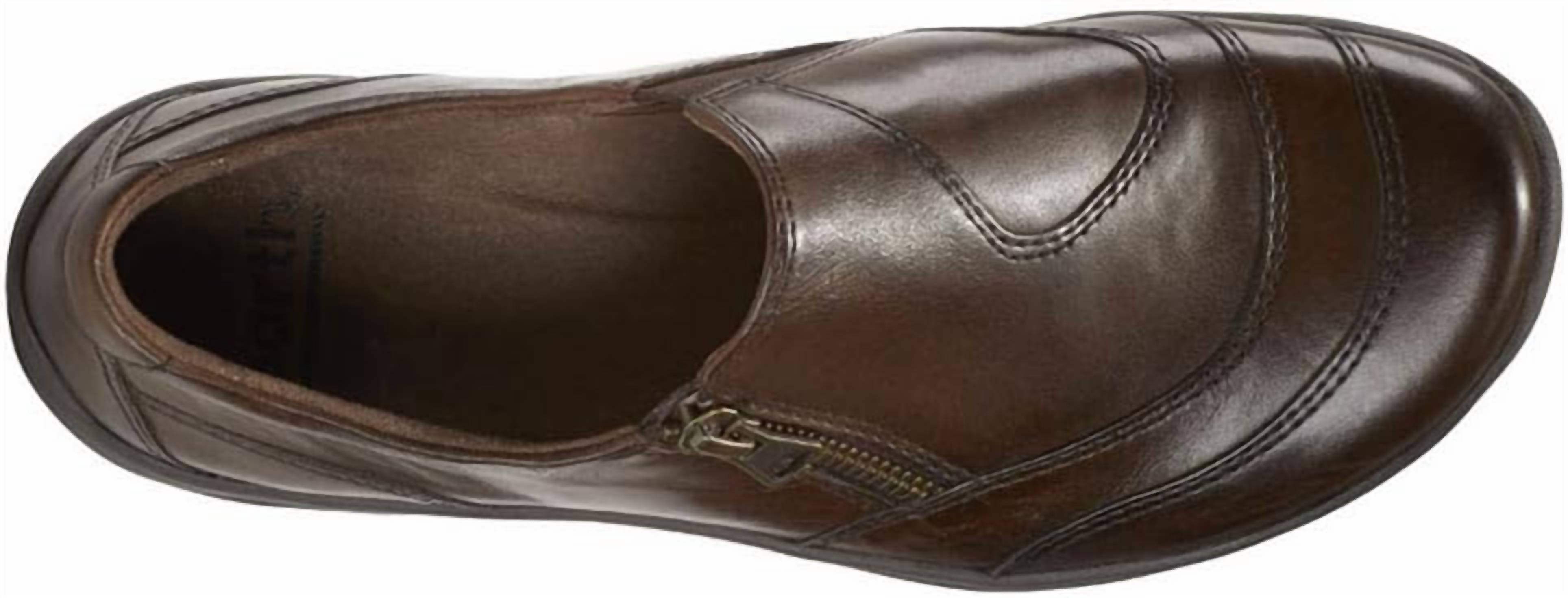 Classicly cute and all-day-wearable. We love this sandal. Introducing the Earth® Women's Kara Faraday Shoes, a stylish flat designed with casual elegance in mind. These sandals in a sophisticated Bark color feature a leather upper complemented by a leather and textile lining, with intricate stitching details adding to its charm. The round toe, side gore, and side zip closure provide easy wearability and a secure fit, while the reinforced arch support and durable rubber outsole ensure comfort and longevity. With a heel height of 1.25 inches and a lightweight design at just 9 oz per shoe, this imported style is perfect for all-day wear.