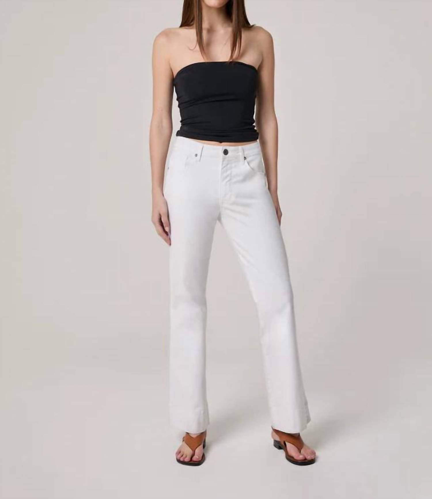 Just as cute as they are comfortable. Introducing the Grant High Rise Long Flare Jeans by Edyson, featuring a high waist and sleek flared leg in optic white. Crafted for comfort, these jeans are composed of 60% Tencel, 38% Cotton, and 2% Spandex, offering a soft stretch fit. They boast a button closure with a zip fly, a clean hem, and practical pockets, with dimensions including a 10.25" rise and 31.25" inseam. Easy to maintain, simply machine wash cold inside out and tumble dry low, but avoid bleach as color transfer may occur when new.