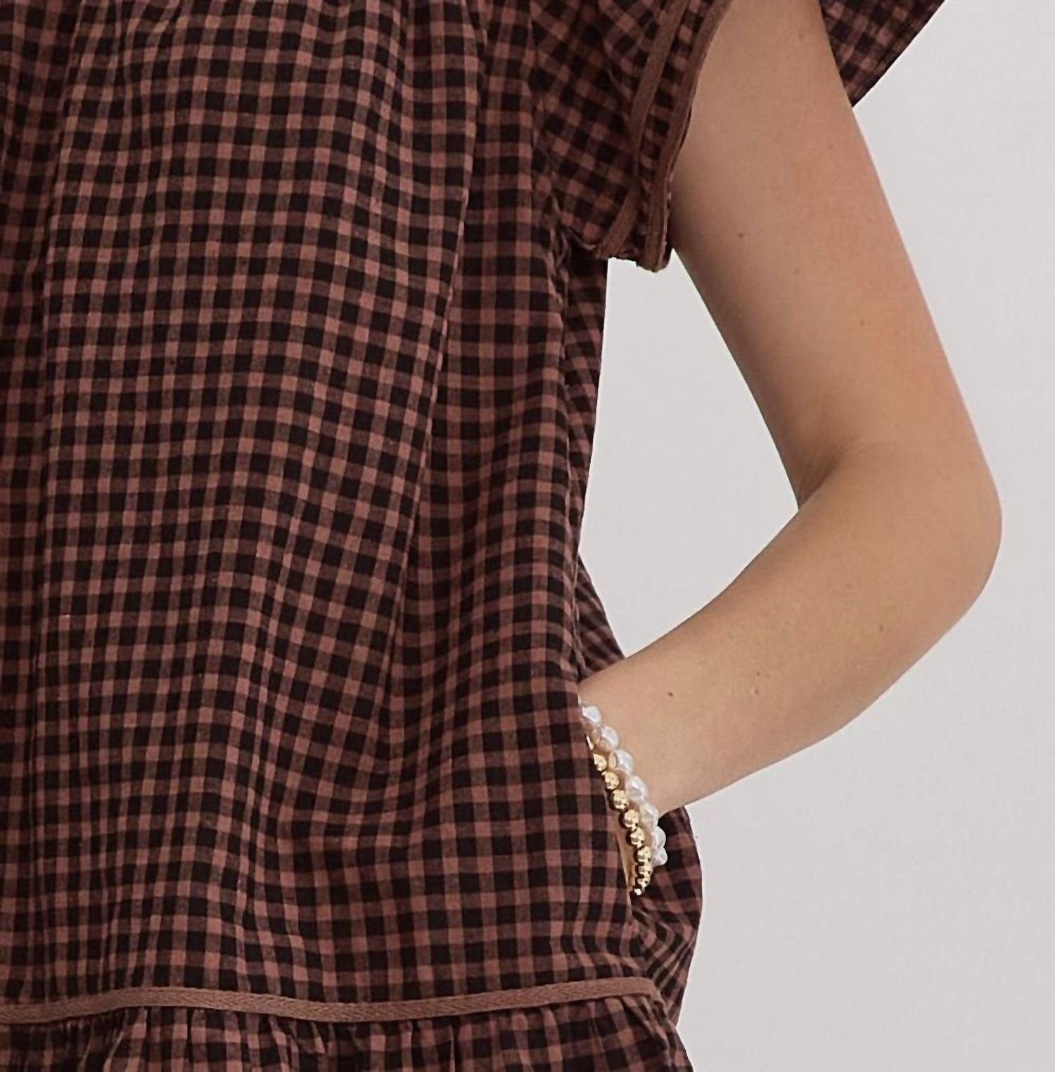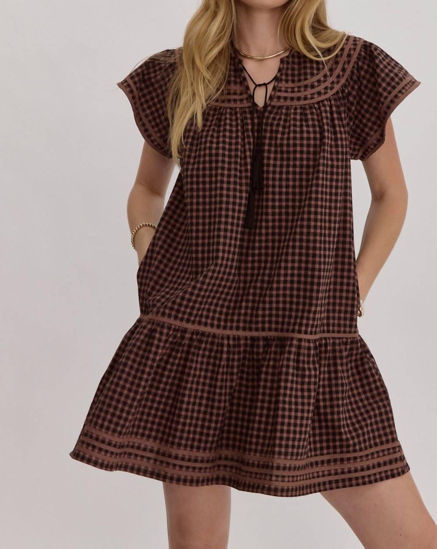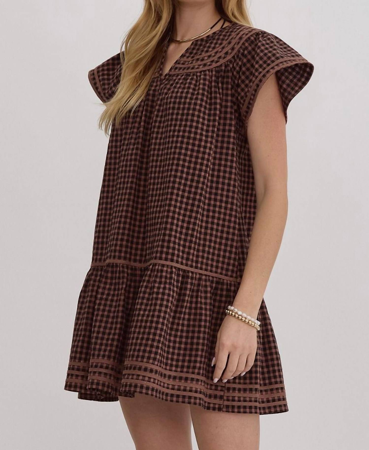 Discover the Gingham Mini Dress by Entro, crafted for chic elegance in a delightful brown pattern. This mini dress features a V-neckline and short sleeves, with its solid trim and sideline pockets adding to the charming design. Made from 100% cotton, it's woven and lightweight, ensuring comfort without compromising style. Perfect for warm days, this A-line silhouette is a must-add to your wardrobe.