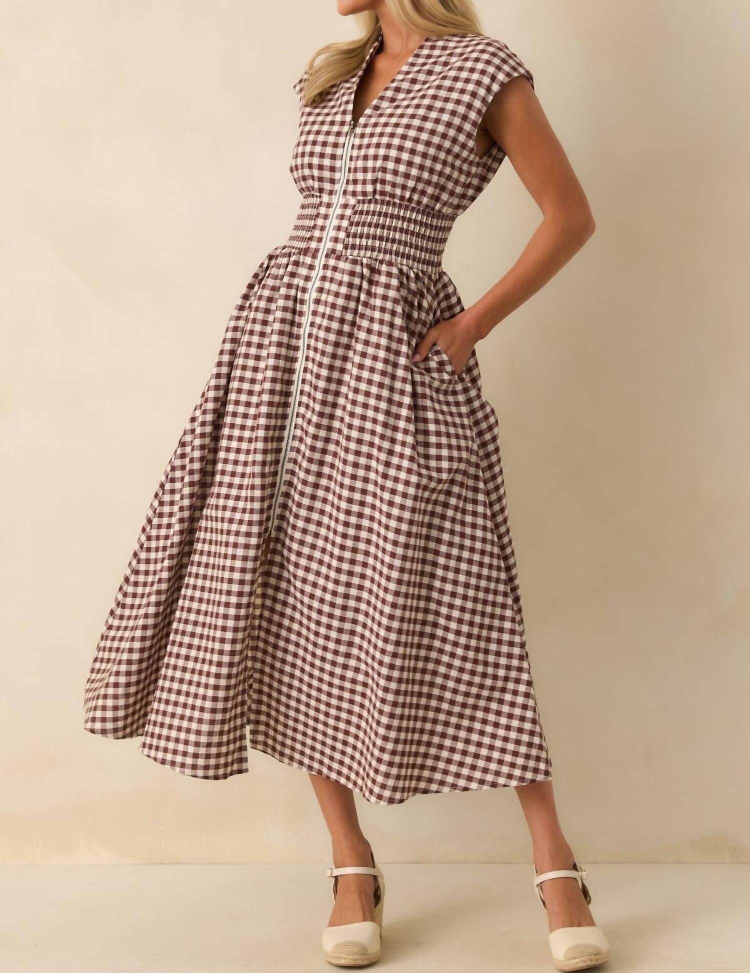 Introducing the Gingham Zip Up Cotton Midi Dress by Entro, a fresh and timeless choice in shades of Sepia and Ivory. This sleeveless dress features a smocked waist, V-neck, and a zip closure for a flattering and easy fit. Crafted from non-stretchy, lightweight 100% cotton, it offers side pockets and a stylish front slit. Care: Hand wash and line dry. Garment specs for size small are Bust: 33", Waist: 26", Length: 47".
