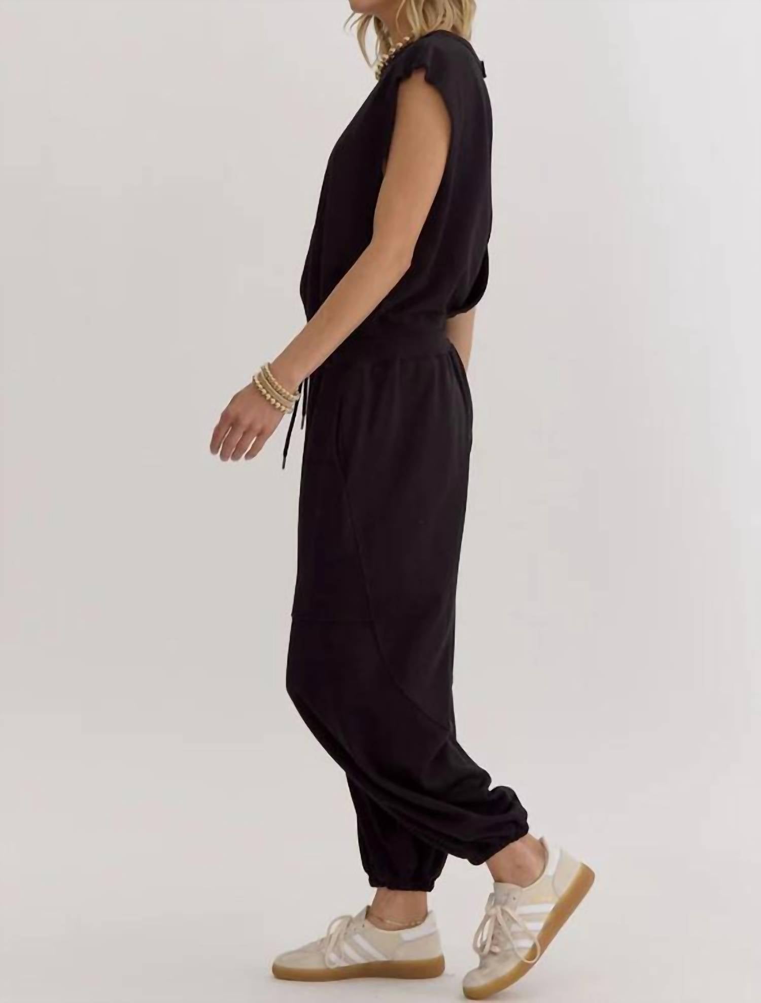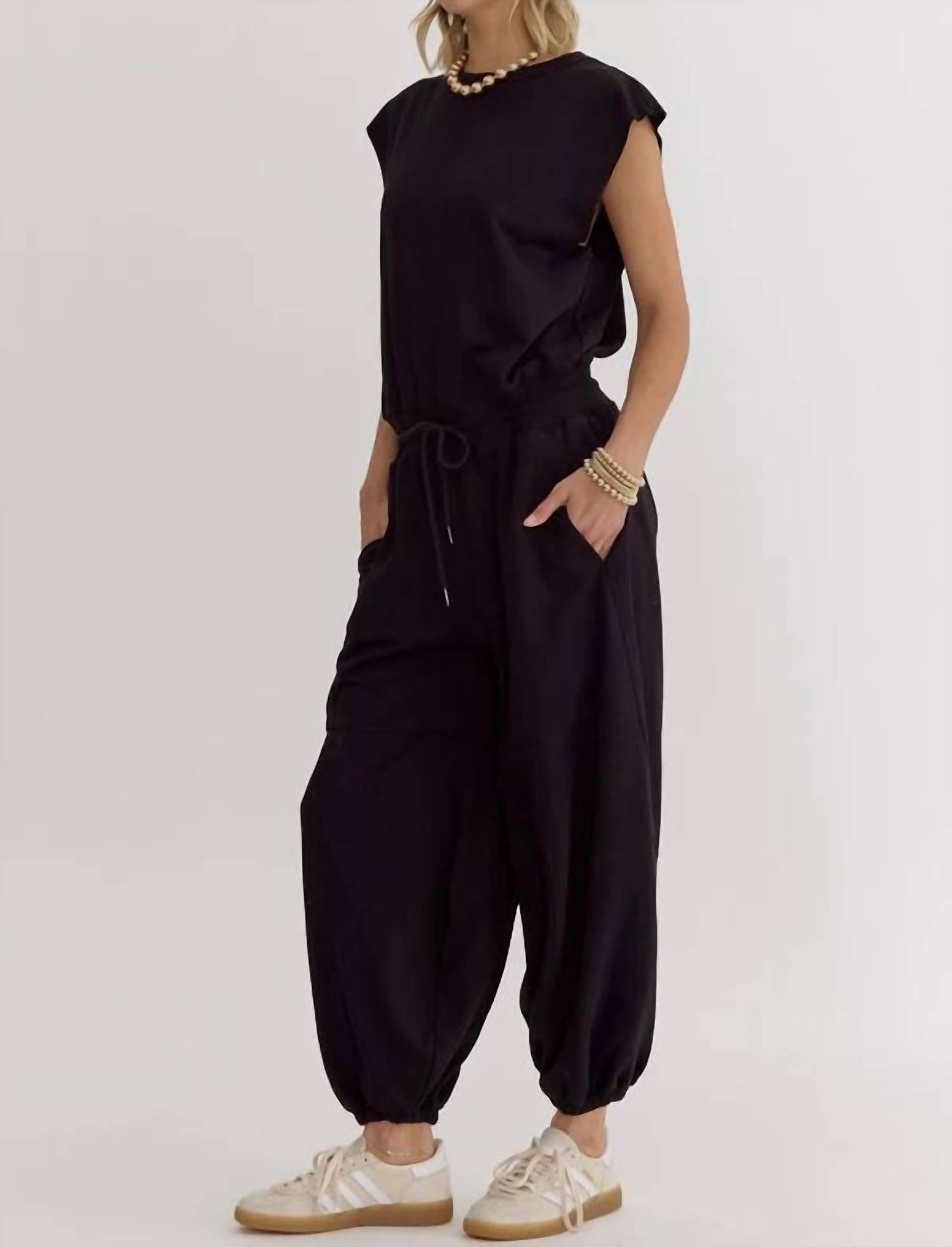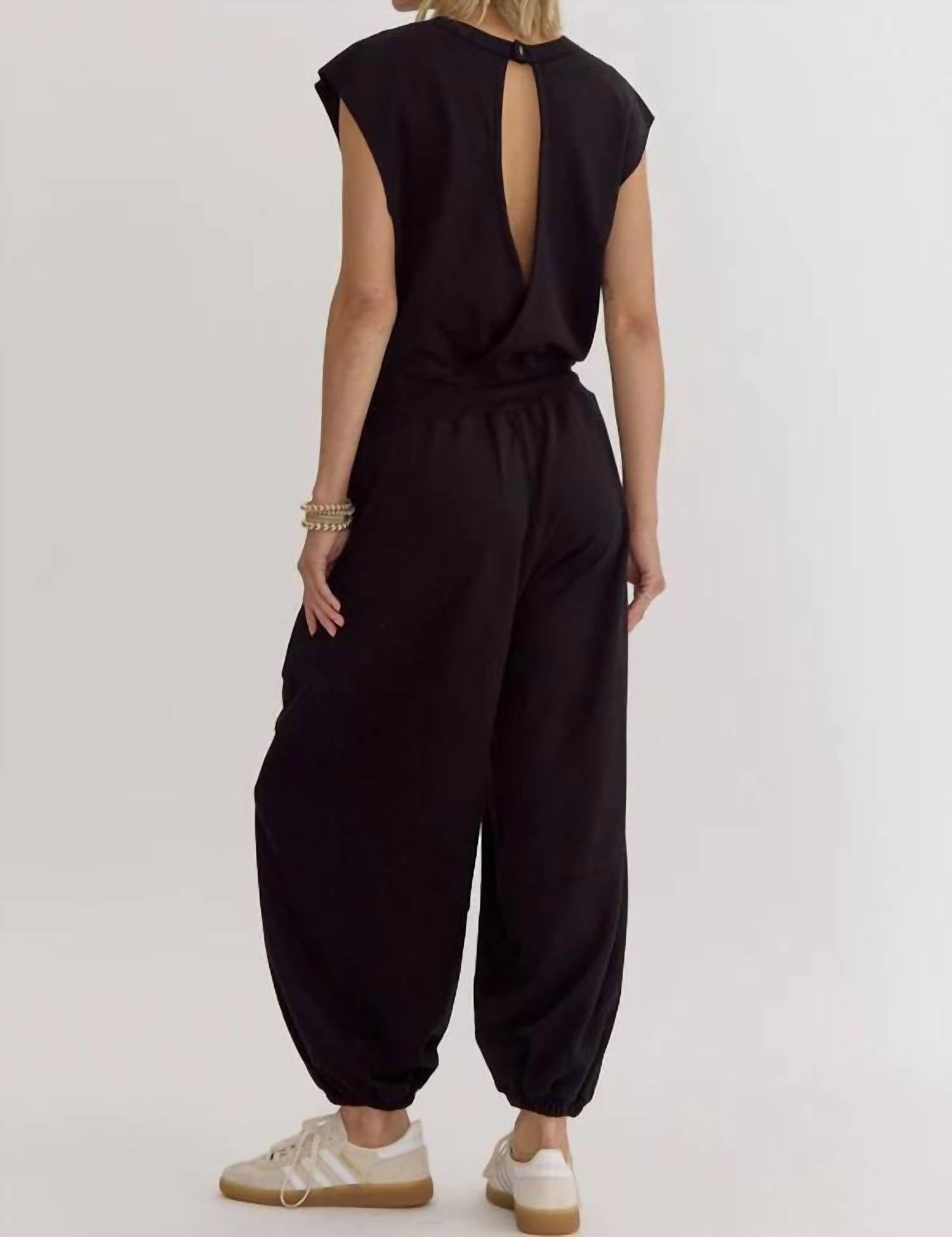 Throw it on and go!Effortlessly chic where luxury meets comfort in every stitch. Crafted from sumptuous black cotton. Drape beautifully over your silhouette. Offering a relaxed fit that seamlessly blends style with ease. Exquisite self-tie waist cinches gently at the waist. Accentuating your natural curves. High-rise design elongates your figure. Sophisticated open back secured by a delicate button closure. Side pockets provide a convenient spot. Cuffed ankles contribute to an effortlessly stylish, laid-back feel.