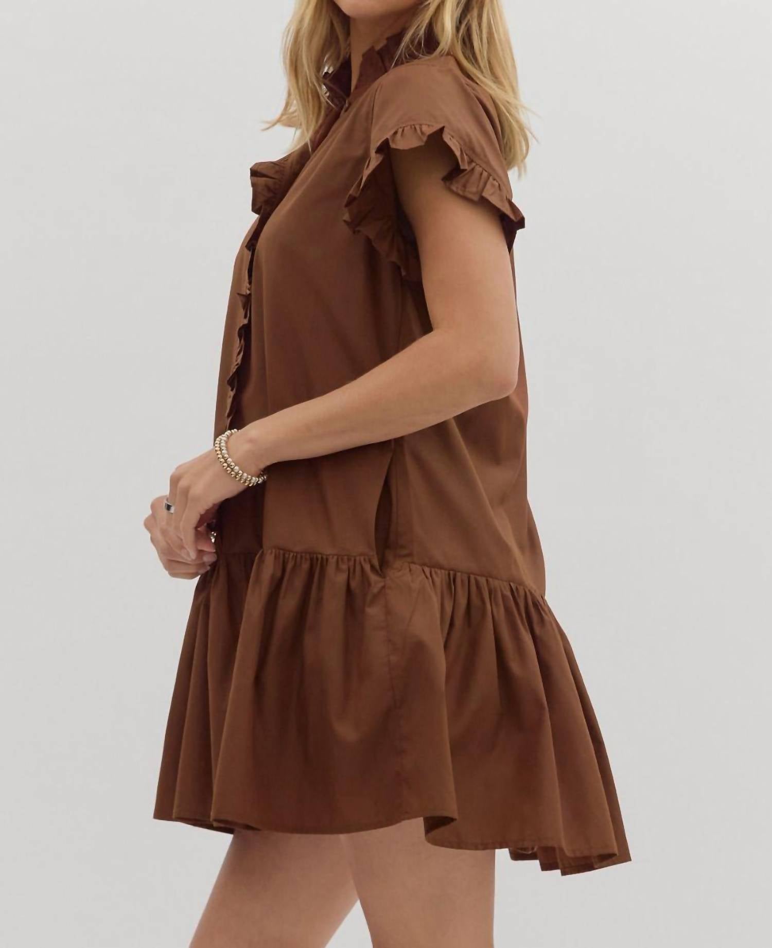 Elevate your summer wardrobe with the Hazel Ruffle Mini Dress by Entro, a chic shift silhouette crafted for modern vacation style. This espresso brown dress features charming cap sleeves, a collar neckline, and eye-catching ruffle trim accents. Made from a comfortable blend of 65% Polyester and 35% Cotton, it boasts practical side pockets and a button closure front. Designed to attract with its minimalist approach, this solid pattern mini-length dress is a must-have for the warm season.