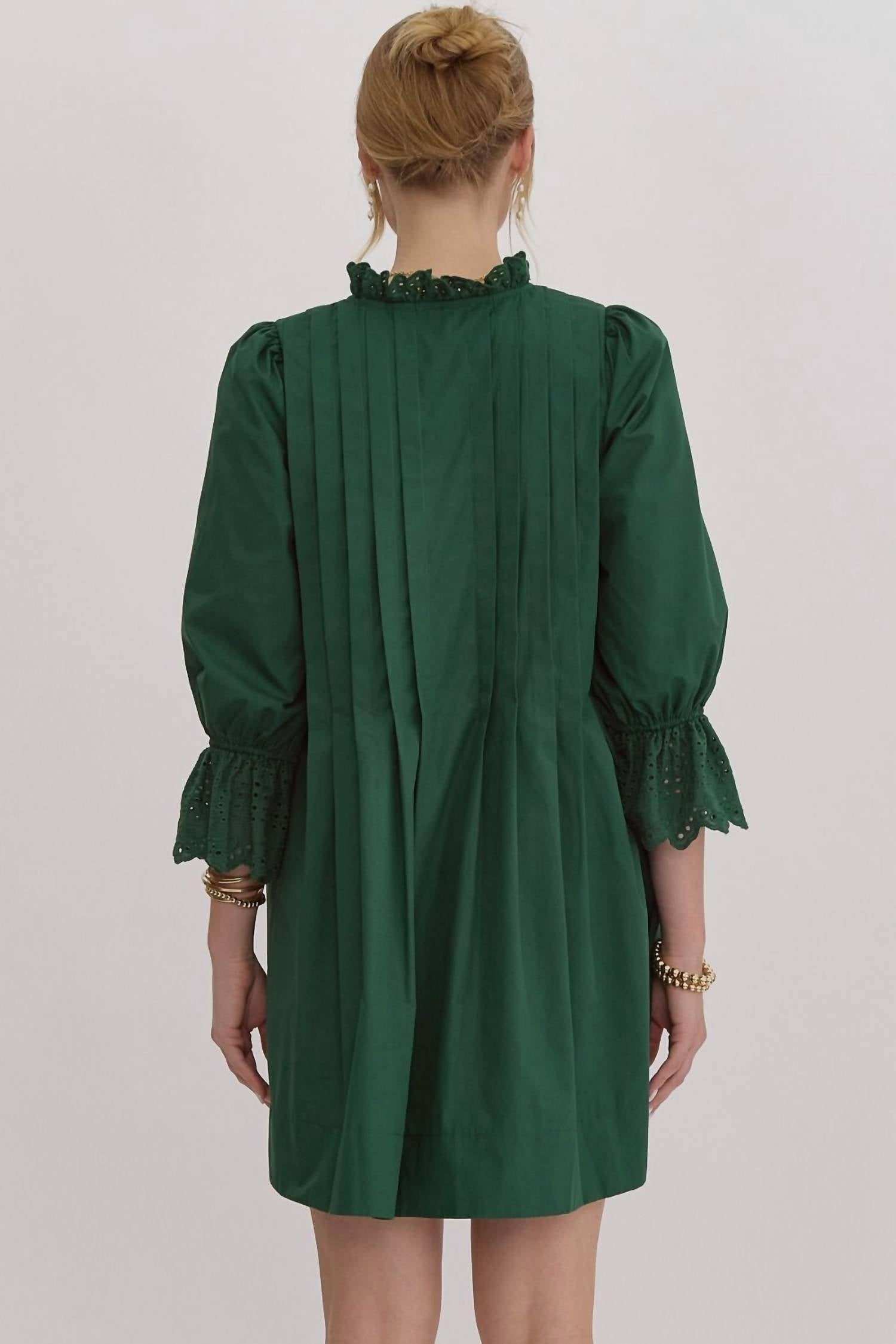 This pleated mini dress features a solid round neck, 3/4 sleeves with eyelet detailing at the cuff and neckline, and a button closure at the front. It has elastic cuffs and convenient pockets at the sides. Lined, made from 100% cotton.
