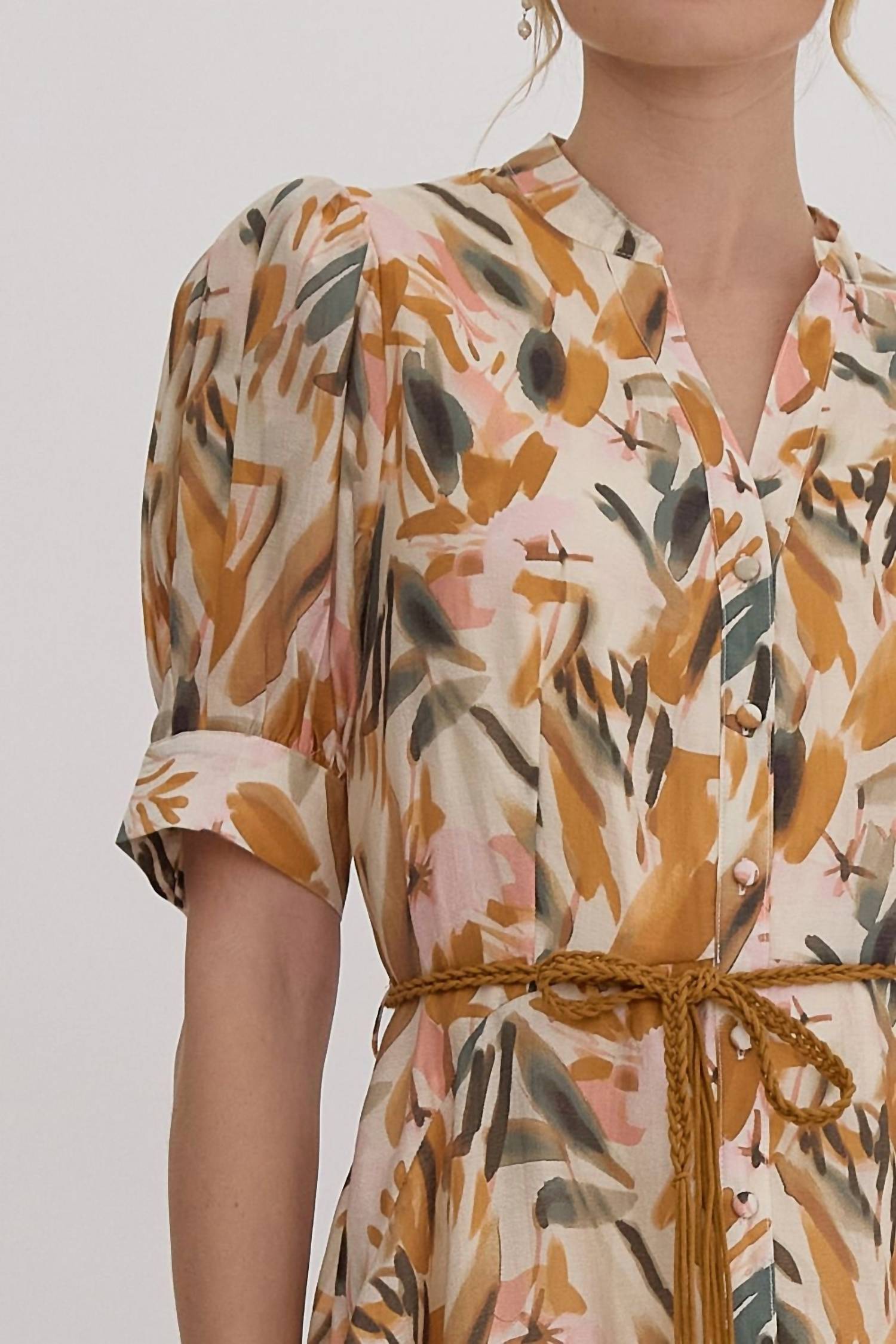 The kind of easy and flattering dress you'll be reaching for all season long.Leaf Print. Button Down. Puff Sleeves. Mini Dress. Removable Braided Belt. Ruffled Hem. Belt Loops. Button Closure At Cuff. Lined. Woven. Non-Sheer. Lightweight. 100% Polyester.
