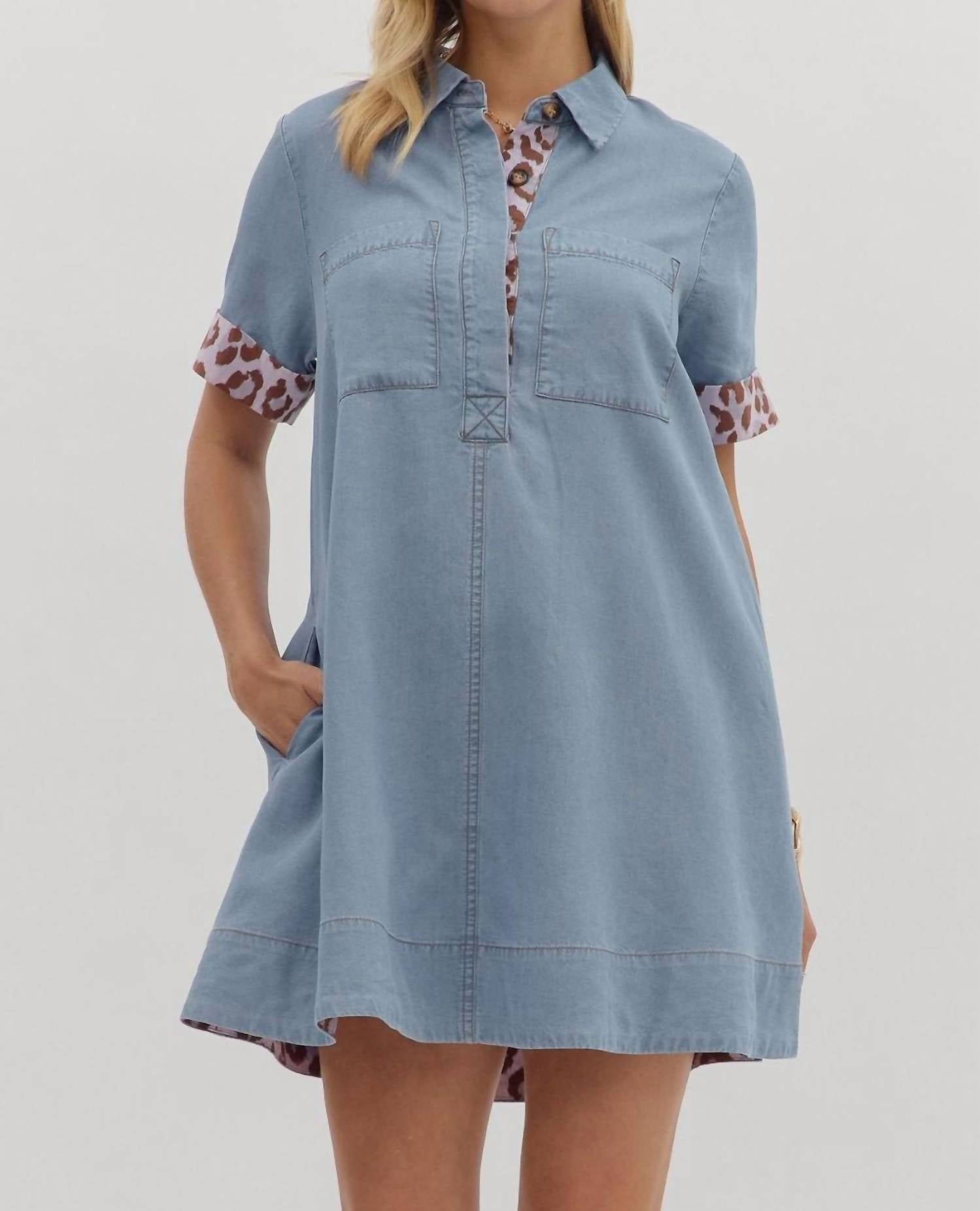 Discover the Leopard Accent Collared Mini Dress by Entro, a chic addition in Chambray Blue perfect for a summer getaway. This short sleeve, shift silhouette dress is crafted from 100% Tencel and features a button closure with stylish leopard pattern cuff and placket accents. With double shirt pockets and side pockets, this lightweight, lined dress offers both style and practicality. Care: Machine wash, tumble dry.