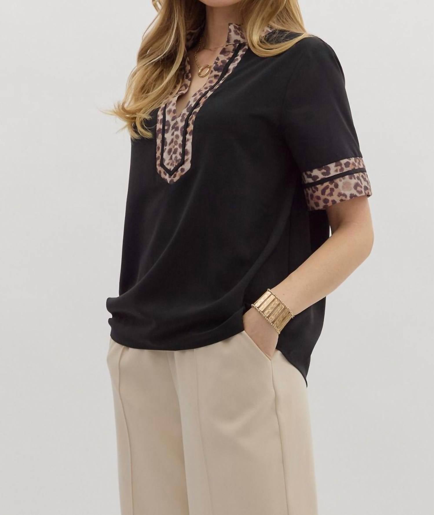 Look no further, you just found your perfect tee! Meet the Leopard Accent Short Sleeve Blouse by Entro, a chic piece perfect for summer vacations with its minimalist design. Made from 100% polyester, this women's top features short sleeves and a distinctive caftan-inspired V-neckline with leopard pattern accents. Designed in a pull-on style, it offers a lightweight and non-sheer finish, making it both stylish and comfortable for warm weather wear. Care: Hand wash and line dry to maintain its quality and vibrant appearance.