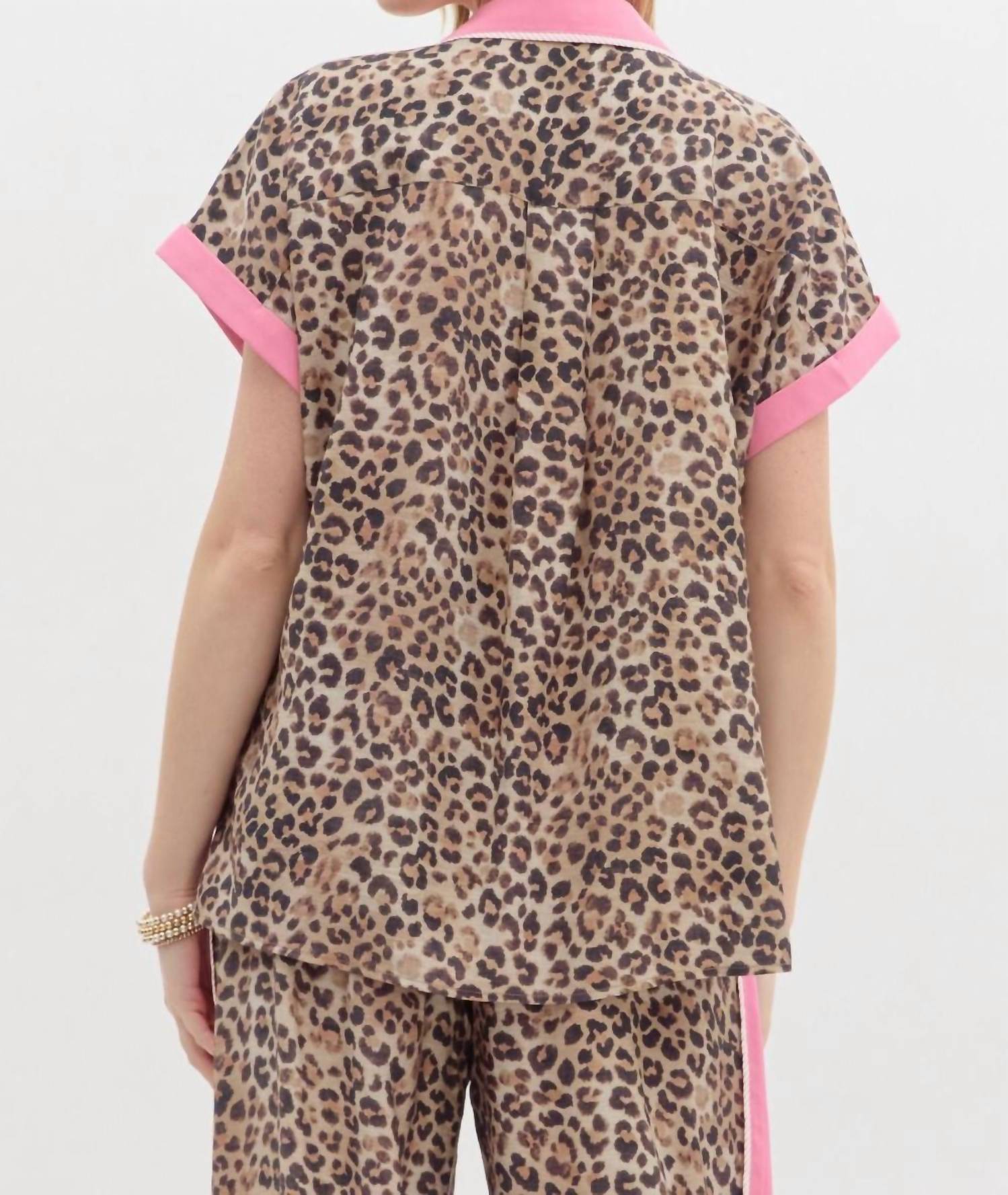 Embrace the wild with the Leopard Button Up Top by Entro, a standout piece for any wardrobe. This brown blouse features a playful animal print with short sleeves and a classic collared neckline. Crafted from a blend of 80% rayon and 20% nylon, it ensures comfort while keeping you in trend. Closure: Button closure. Complete the look with the matching wide-leg pants for a stunning set.