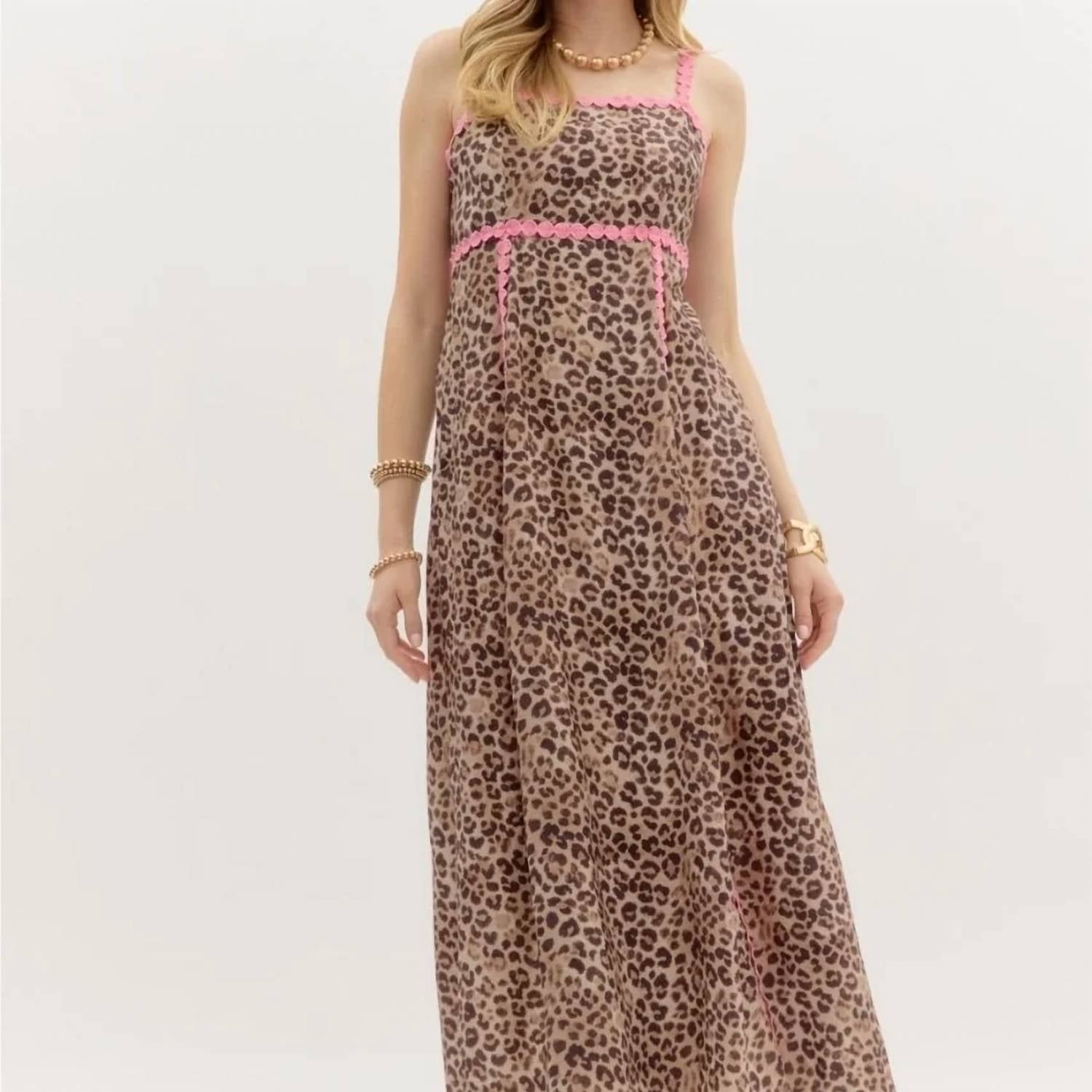 A maxi dress that is just as cute as it is comfortable. Embrace vintage flair with the Leopard Sundress With Ric Rac Trim by Entro, perfect for a summer wardrobe refresh. This brown and pink animal pattern dress features spaghetti straps and a flattering empire waist silhouette, coupled with a square neckline for a chic look. Crafted from 80% rayon and 20% nylon, it offers a comfortable pull-on closure and the convenience of side pockets. Care is a breeze with machine wash instructions, while the smocked back panel and trim-accented adjustable straps ensure a customizable fit.