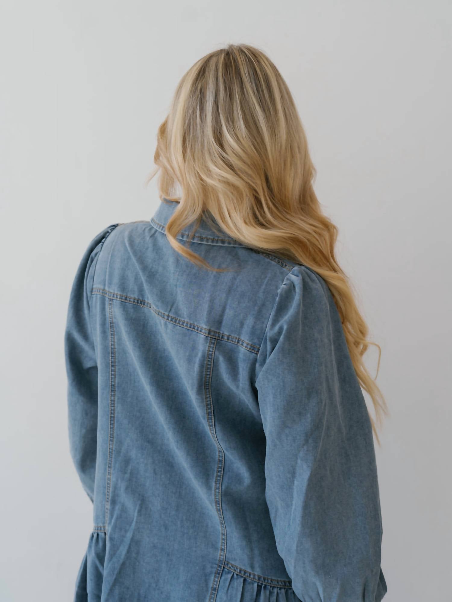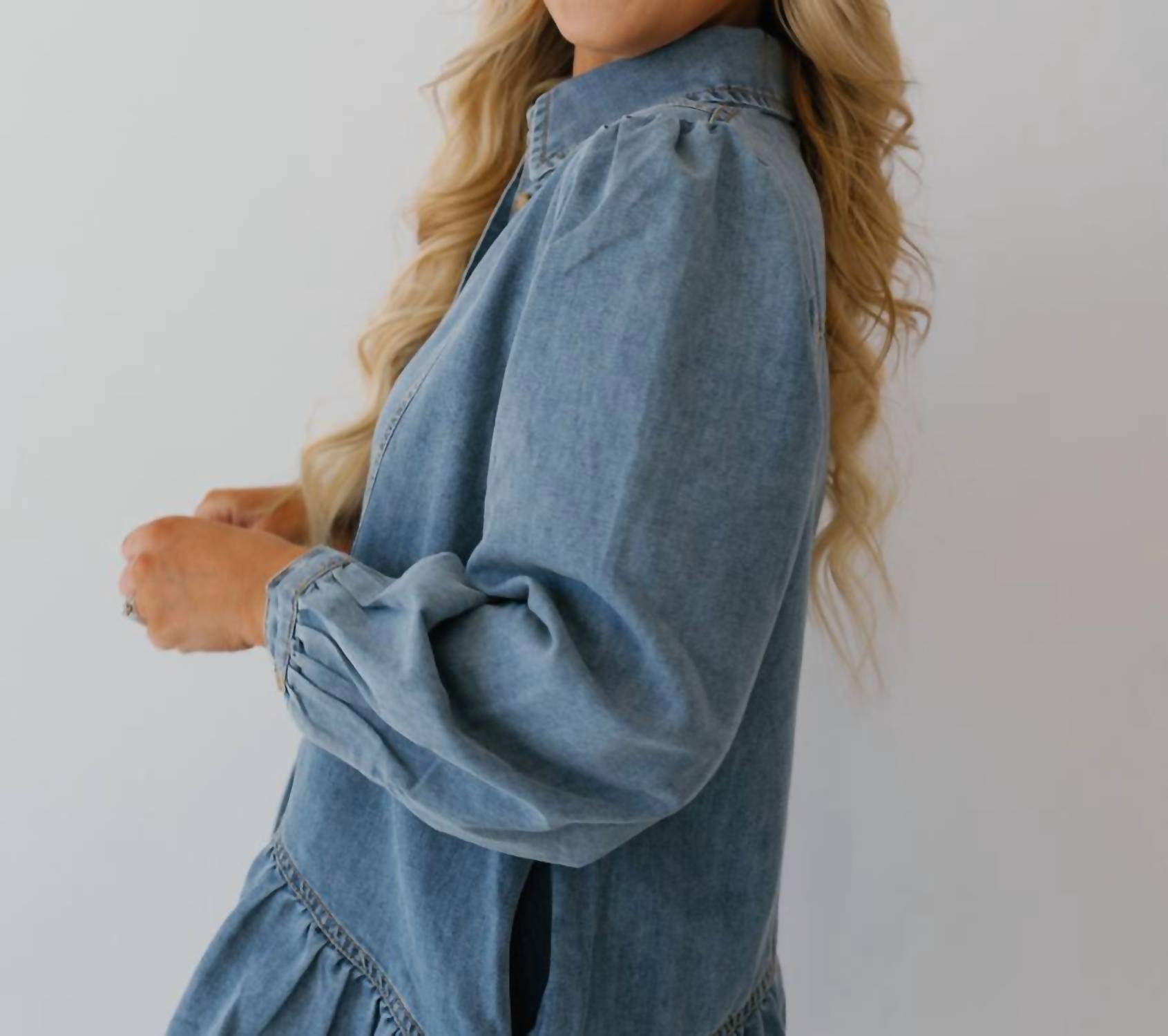 A short and breezy dress for those warmer days. Step out in style with the Entro Long Sleeve Denim Dress in a classic medium wash, perfect for fall occasions or casual outings. Crafted from a cotton blend of 85% cotton and 15% polyester, this mini dress is lightweight and features a flattering A-line silhouette with a ruffled hem. Designed with practicality in mind, it includes convenient hidden side pockets and a button closure with a collar neckline. Care requires a gentle hand wash in cold water and line drying to maintain its textured appearance.
