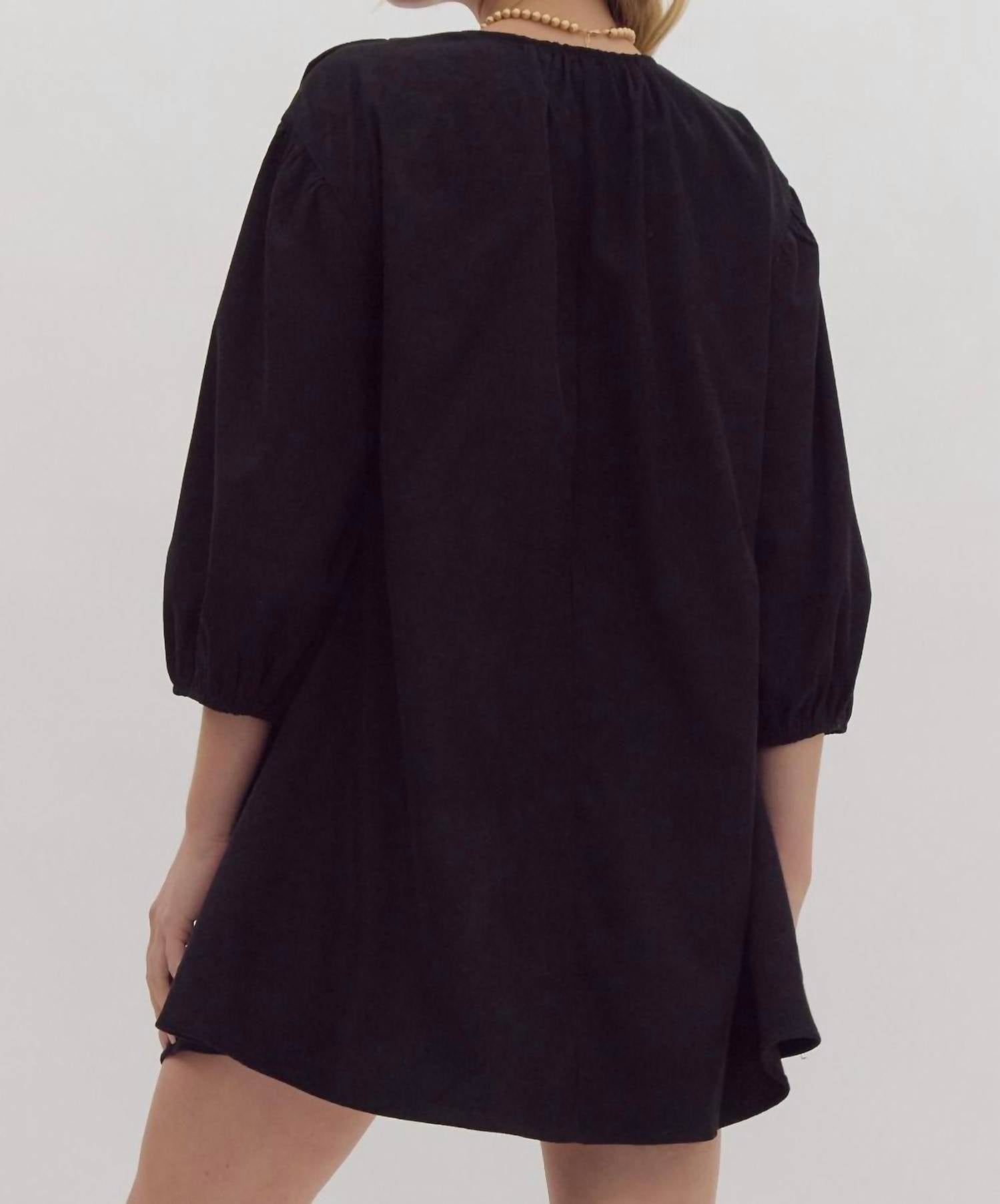 The perfect mini dress for those warmer months. Introducing the Marianne Dress by Entro, an effortlessly elegant mini dress in solid black. Crafted with three-quarter-length puff sleeves and a flattering shift silhouette, it features a playful scalloped bodice detail and a subtle V-neckline. This comfortable garment offers a chic look with its pull-on closure and convenient pockets. A versatile piece, it seamlessly transitions from casual outings to special occasions.