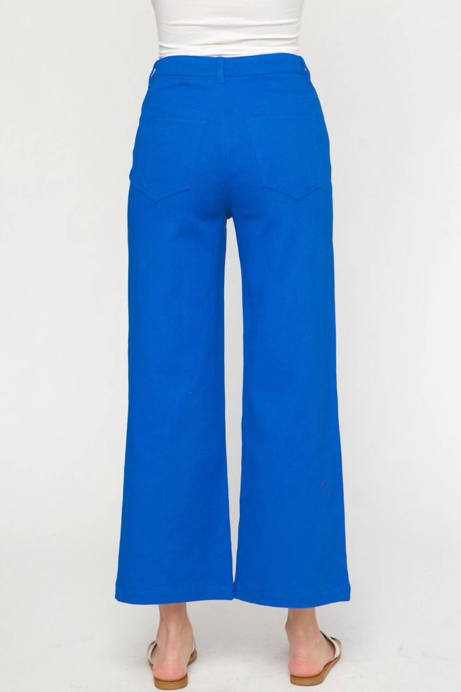 Effortless elegance. Perfect blend of style and comfort. Crafted from a lightweight woven blend of 97% cotton and 3% spandex. Offer a relaxed fit. High-waisted design accentuates your silhouette. Wide leg cut. Practical side and back pockets. Seamlessly merge utility with chic aesthetics. Zipper front closure with a button detail provides a secure fit. Non-sheer pants. Adding a pop of royal elegance to your outfit.