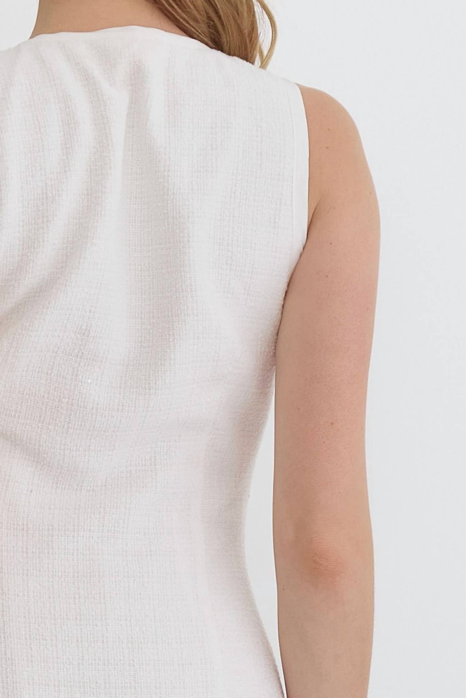 The perfect mini dress for those warmer months. Introducing the Old Fashioned Feeling Tweed Dress by Entro, a chic off-white mini dress perfect for elevating your style. This sleeveless A-line dress showcases a round neck and features contrast stitching for added detail. Composition: 73% Polyester, 27% Rayon, with a convenient dual zip closure. The dress is lined and woven, offering a non-sheer and lightweight feel. The model is 5'10" and wearing a size Small.