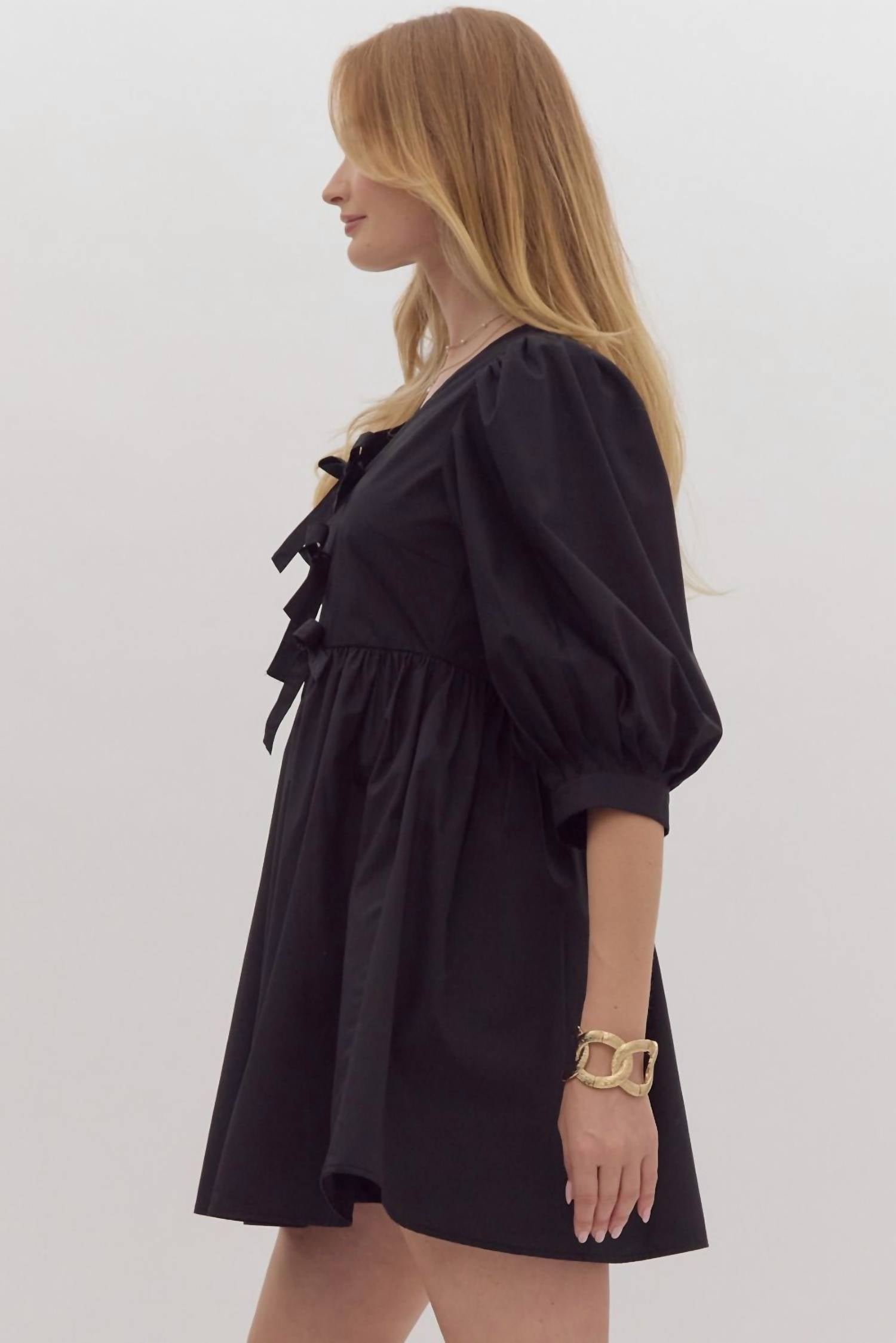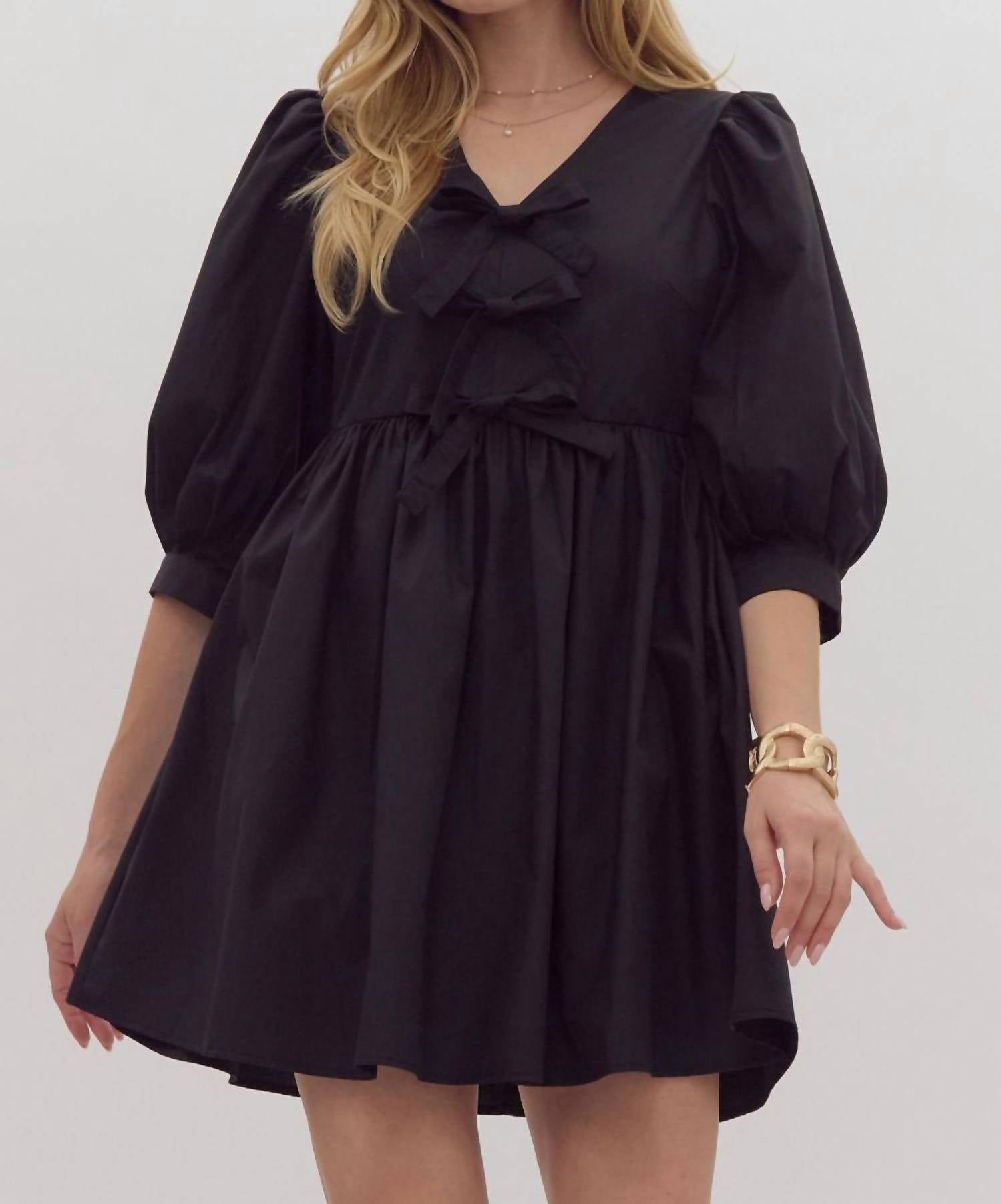 The kind of easy and flattering dress you'll be reaching for all season long. Introducing the On Occasion Bow Dress by Entro, a chic mini dress in solid black perfect for any event. Crafted with three-quarter puff sleeves, it features a stylish fixed bow below the elegant V-neck. The dress is lightweight, woven, lined, and designed with a convenient back zipper closure. Elevate your wardrobe with this empire waist silhouette that promises effortless sophistication.