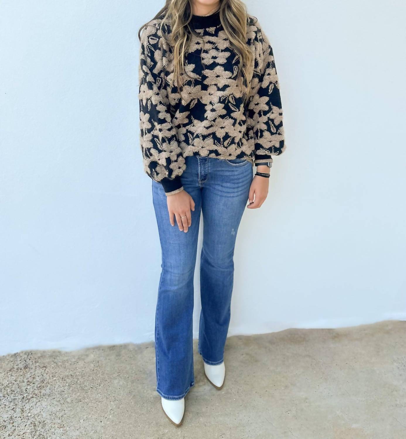Elevate your style with the "One Of Your Girls Floral Sweater" by Entro, a chic piece ideal for cooler days. This knit sweater top showcases a stunning floral jacquard pattern and features long, billowy sleeves for added drama. Crafted from a blend of 45% Acrylic, 30% Polyester, and 25% Nylon, this midweight sweater offers both comfort and durability. Model is 5'10" and wearing a size Small.