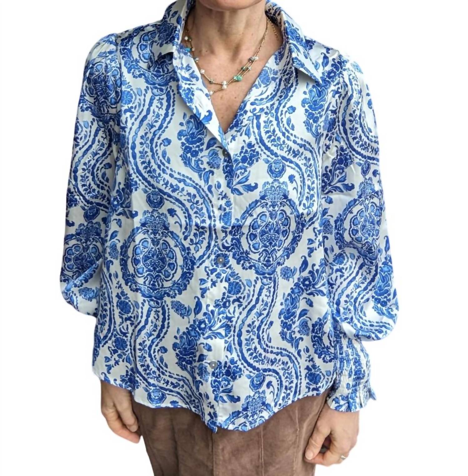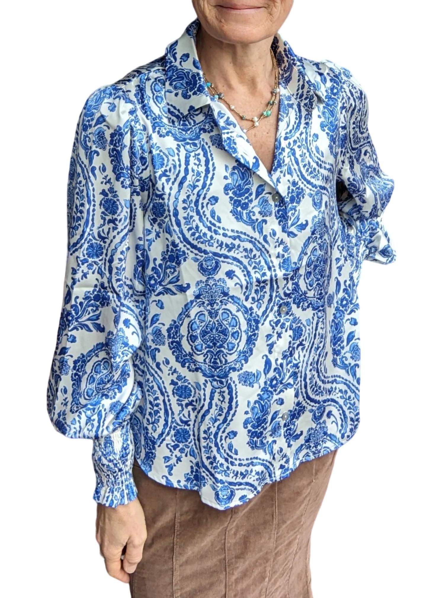 This button down shirt is comfortable yet polished.Royal Blue Paisley Button Down Blouse is collared with elastic cuff sleeves. Designed for comfort and easy movement. Ideal for stylish occasions.