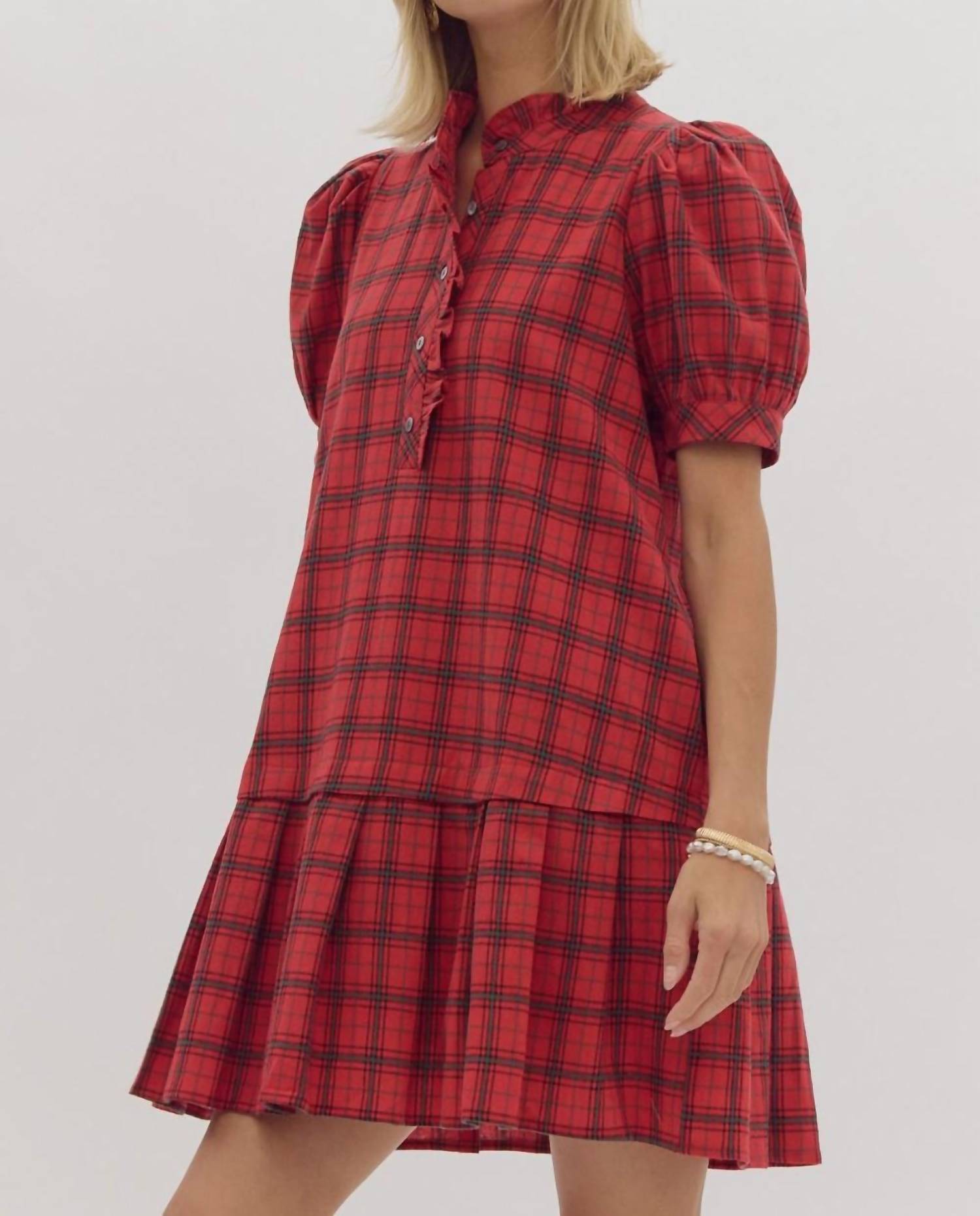 With its short sleeves and classic plaid print, this mini dress is crafted from 100% cotton, ensuring a lightweight and comfortable fit. It features a ruffled trim at the mockneck neckline and is effortlessly styled with a functional button closure and side pockets for added convenience.