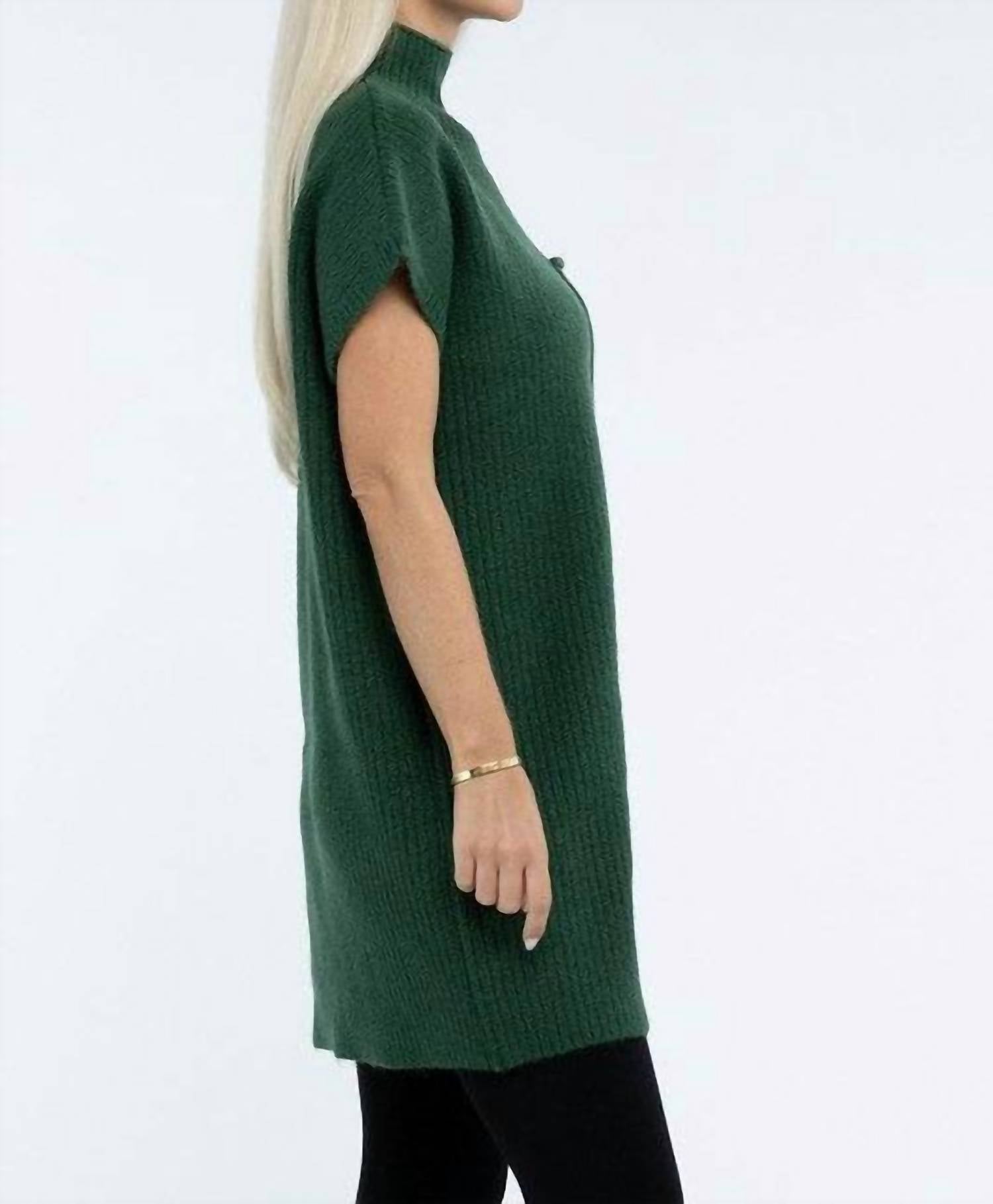 The Ribbed Sweater Dress by Entro in Forest is a stylish and practical addition to your wardrobe. This mini-length dress features a chic mock neck and short sleeves, offering a sophisticated look. Made from quality acrylic, it boasts a convenient pocket for added functionality. Closure is a simple pull-on style, and it's easy to care for with machine wash and tumble dry instructions.