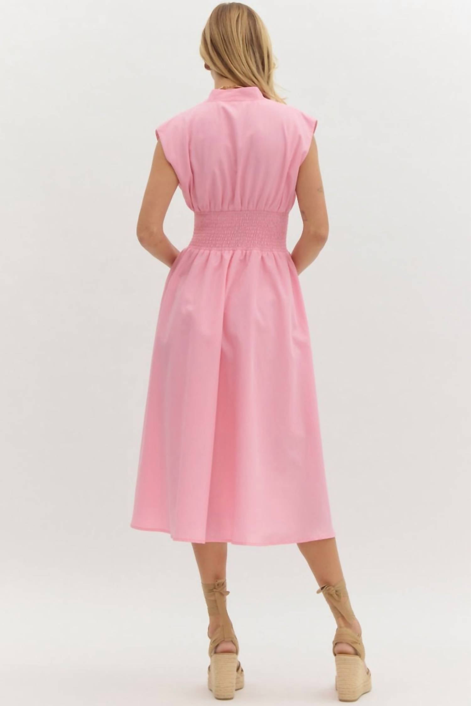 Introducing the Rosebay Zip Midi Dress by Entro, a stylish piece in a chic pink hue perfect for embracing spring trends. This sleeveless dress features a flattering V-neckline and a smocked waist that elegantly highlights your silhouette. Expertly crafted from a 55% Cotton, 45% Poly blend, it ensures both comfort and effortless style. Closure: Gold front zip. Care: Machine wash. Ideal for travel and Easter celebrations, this A-line dress pairs beautifully with statement jewelry and heels.