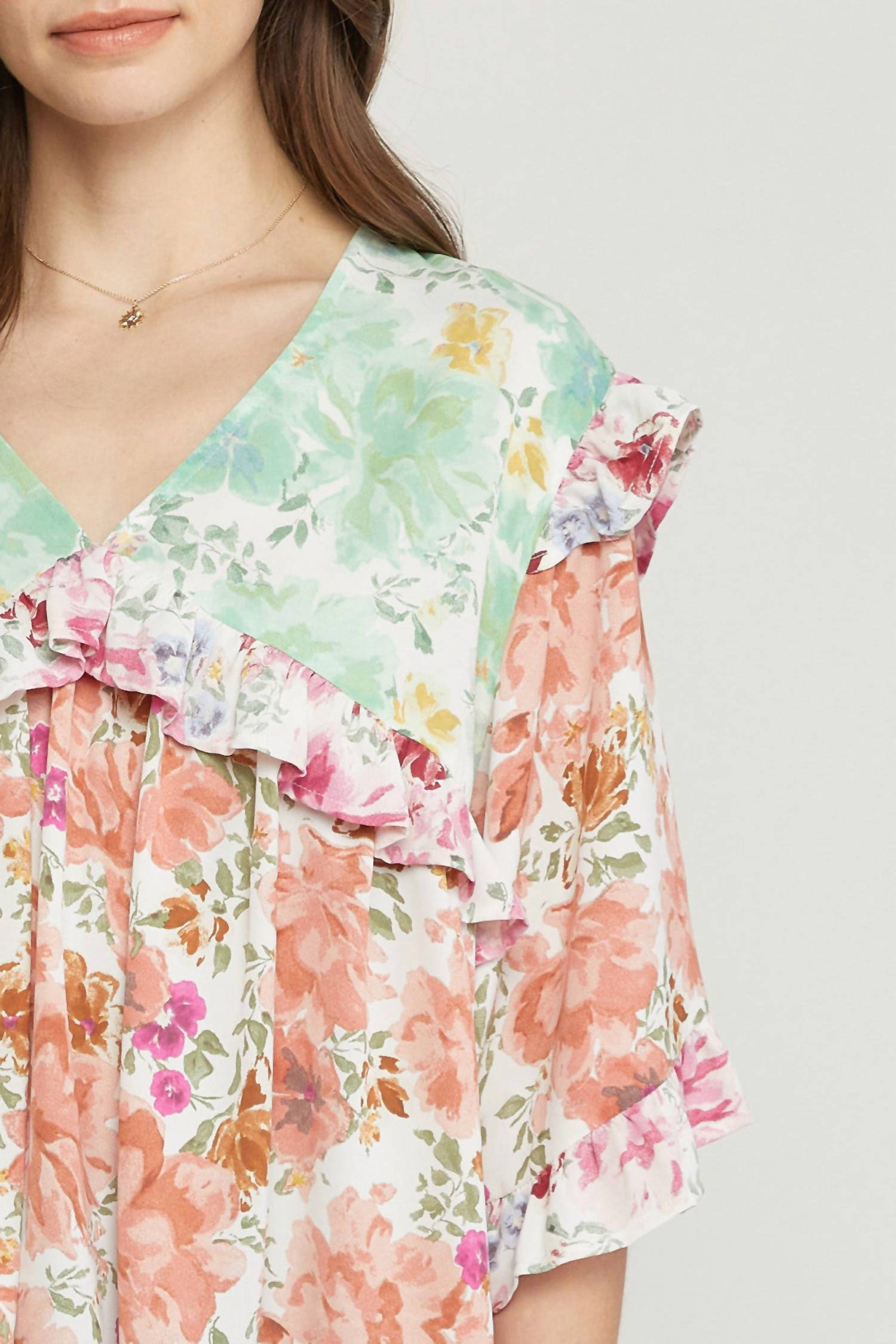 A timeless blouse that will never go out of style. The Ruffled & Floral Top by Entro is a chic addition to your wardrobe, perfect for summer and designed with boho-chic flair. Featuring three-quarter sleeves and a lightweight feel, this blouse offers a flattering a-line silhouette with a V-neck and ruffled detailing. Made from 100% polyester, it showcases a vibrant floral pattern and a tie closure at the back for a touch of elegance. Sizes range from Small (Bust 40", Length 26") to 2X (Bust 50", Length 31"), and it can be hand washed or dry cleaned for easy care.
