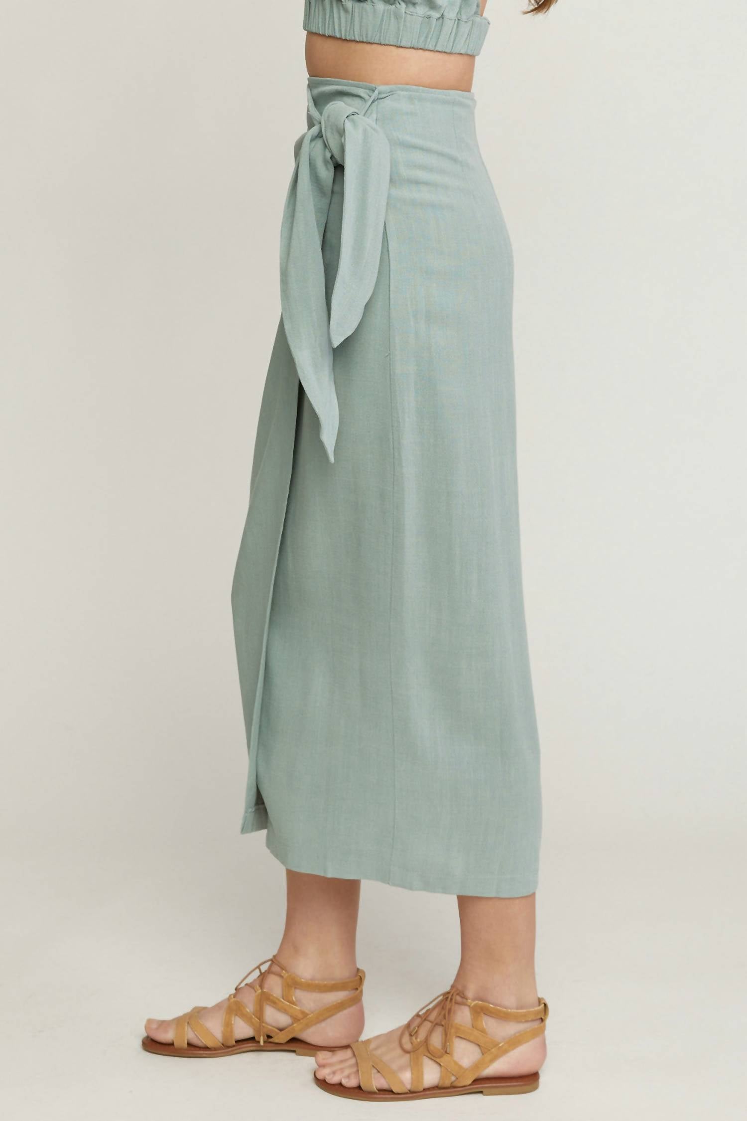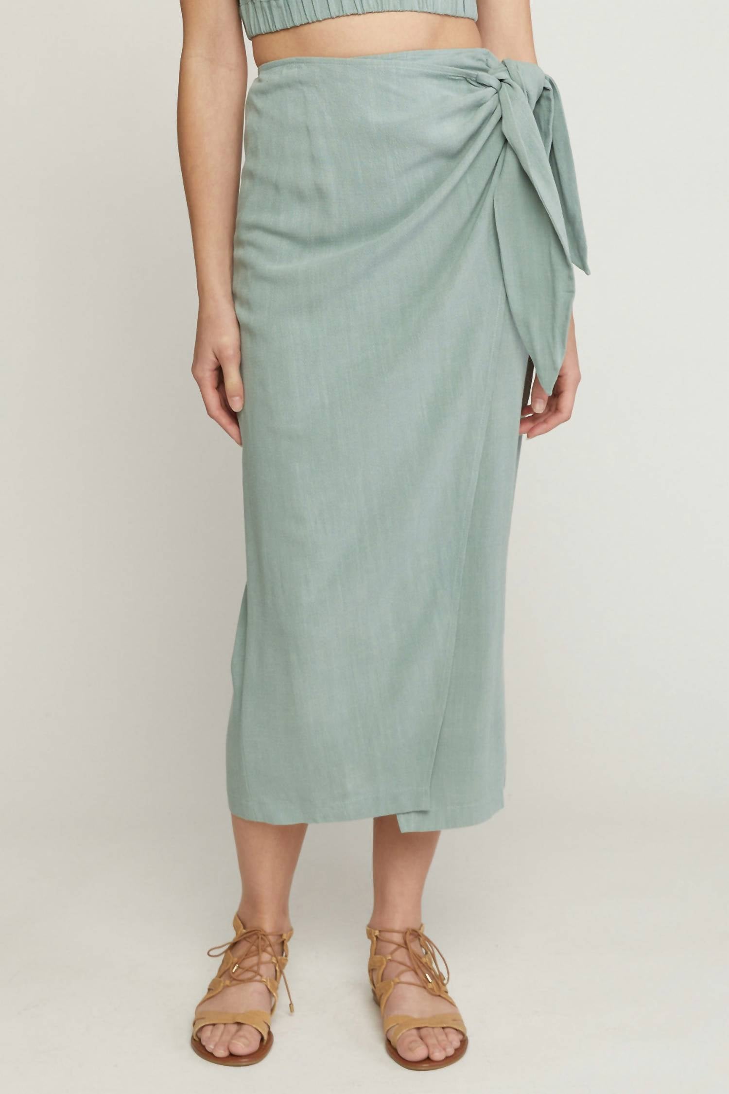 Tuck your favorite tee into this midi length skirt for an effortlessly cool look.Solid sarong midi skirt featuring front slit and self tie at side. Invisible button closure inside. Lined. Woven. Non-sheer. Lightweight.