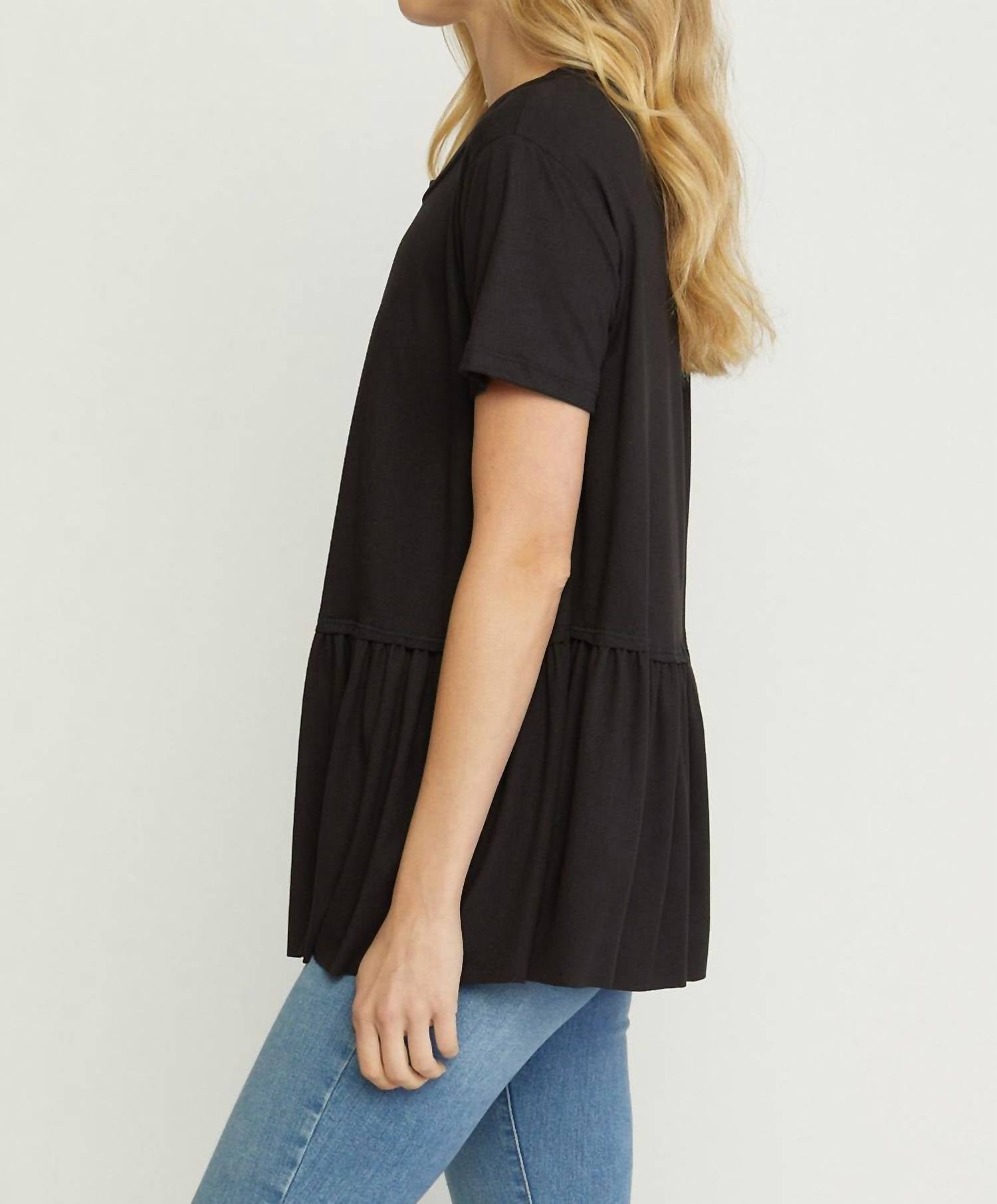 A versatile blouse that works from desk to dinner! Classic fit.It features a round neckline, short sleeves, a peplum at the hem, is light weight and has an oversize silhouette. Small: Bust 40" Length 28", Medium: B 42 L 28", Large: Bust 44" L 28", XL: Bust 50" Length 30", 1X: Bust 52" L 30", 2X: Bust 54" L 30". 94% Polyester, 6% Spandex. Soft stretchy fabric. Hand wash or dry clean. Made in the USA.