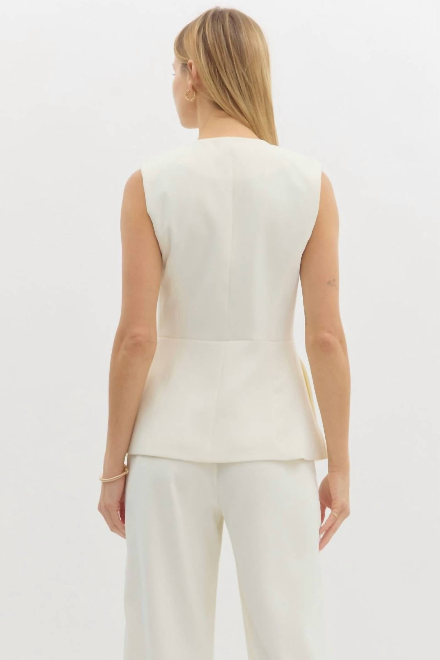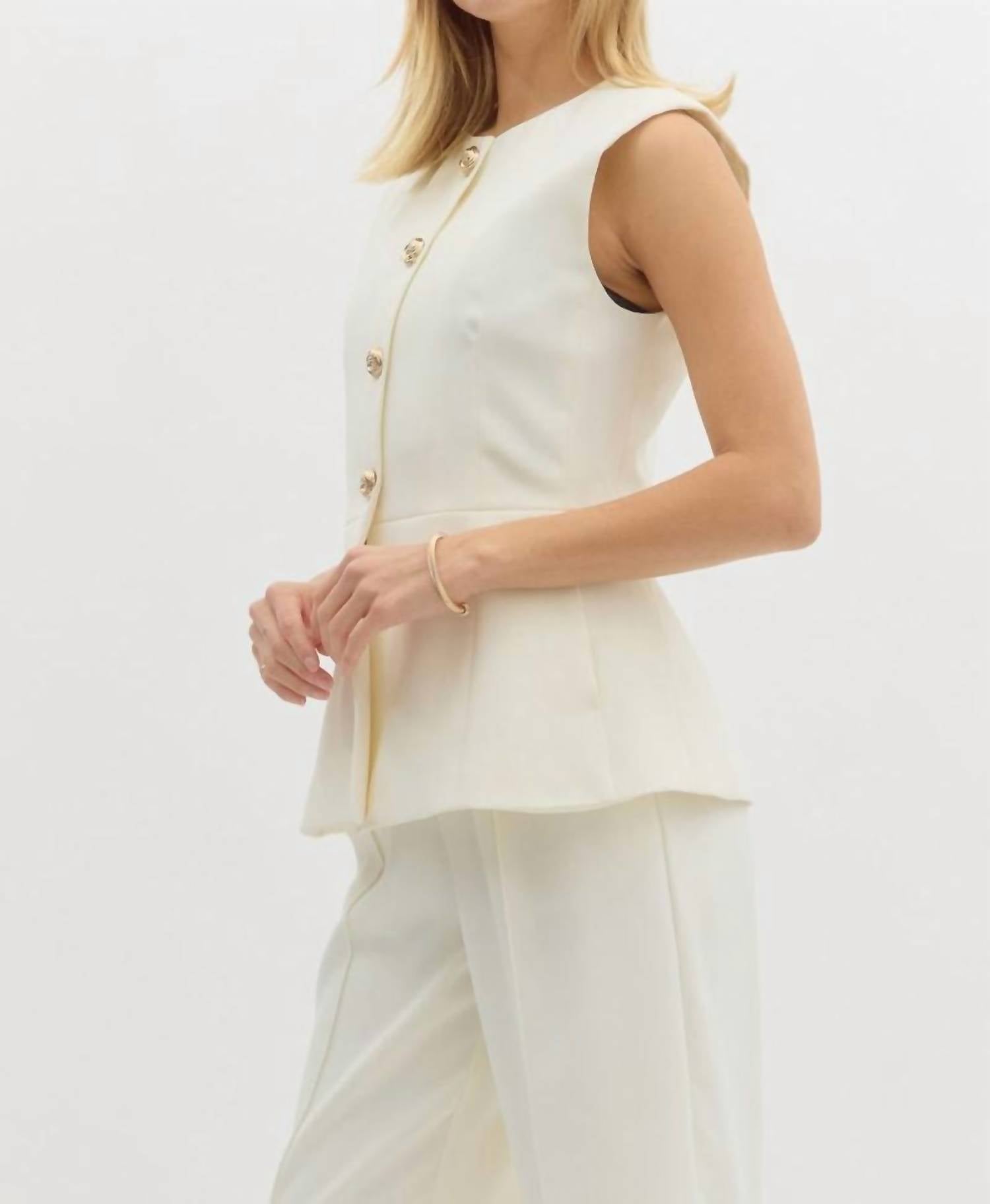 A vest so versatile you can mix and match it with almost any outfit and it will feel brand new every time. Introducing the Entro Sleeveless Gold Button Detail Top in a sophisticated cream hue, perfect for adding a touch of elegance to your wardrobe. Made from 100% polyester, this chic piece features a classic crewneck and a stylish button closure. Ideal for evening events, this top channels a workwear trend with its timeless design. Care instructions include hand wash only, ensuring your garment stays pristine.