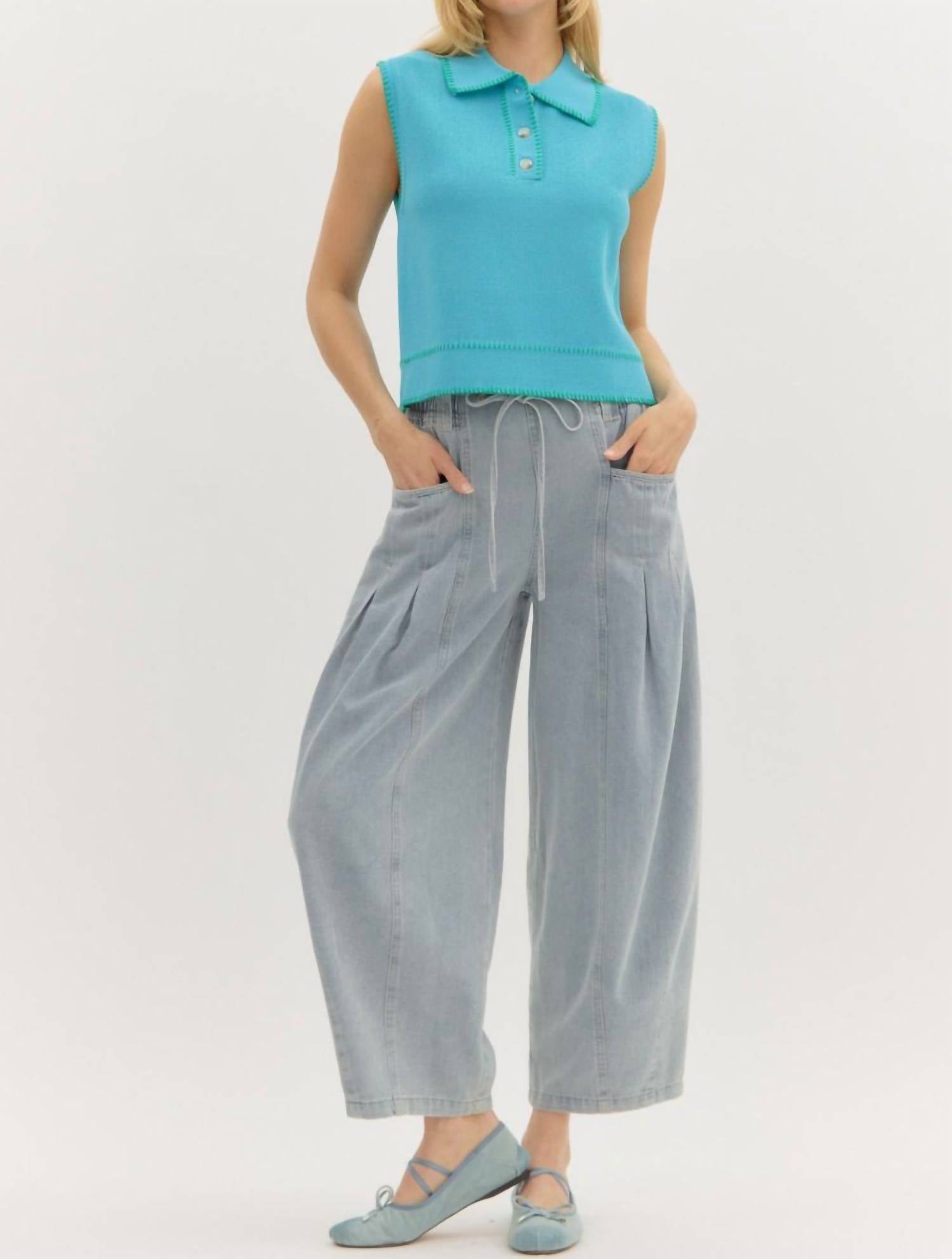 Elevate your summer wardrobe with the Sleeveless Pullover Top by Entro, a perfect choice for holiday parties. Designed in a solid blue pattern, this knit piece features a blanket stitch accent collar with a button closure. Crafted in lightweight knit material, it offers a comfortable fit while being unlined and non-sheer. Care instructions recommend machine washing to maintain its vibrant look.