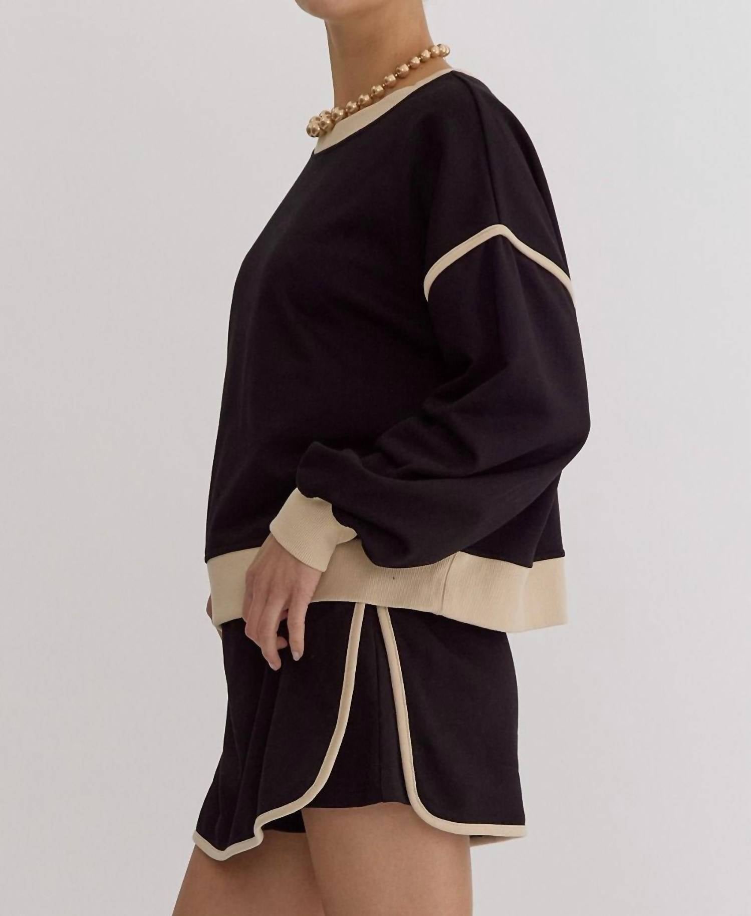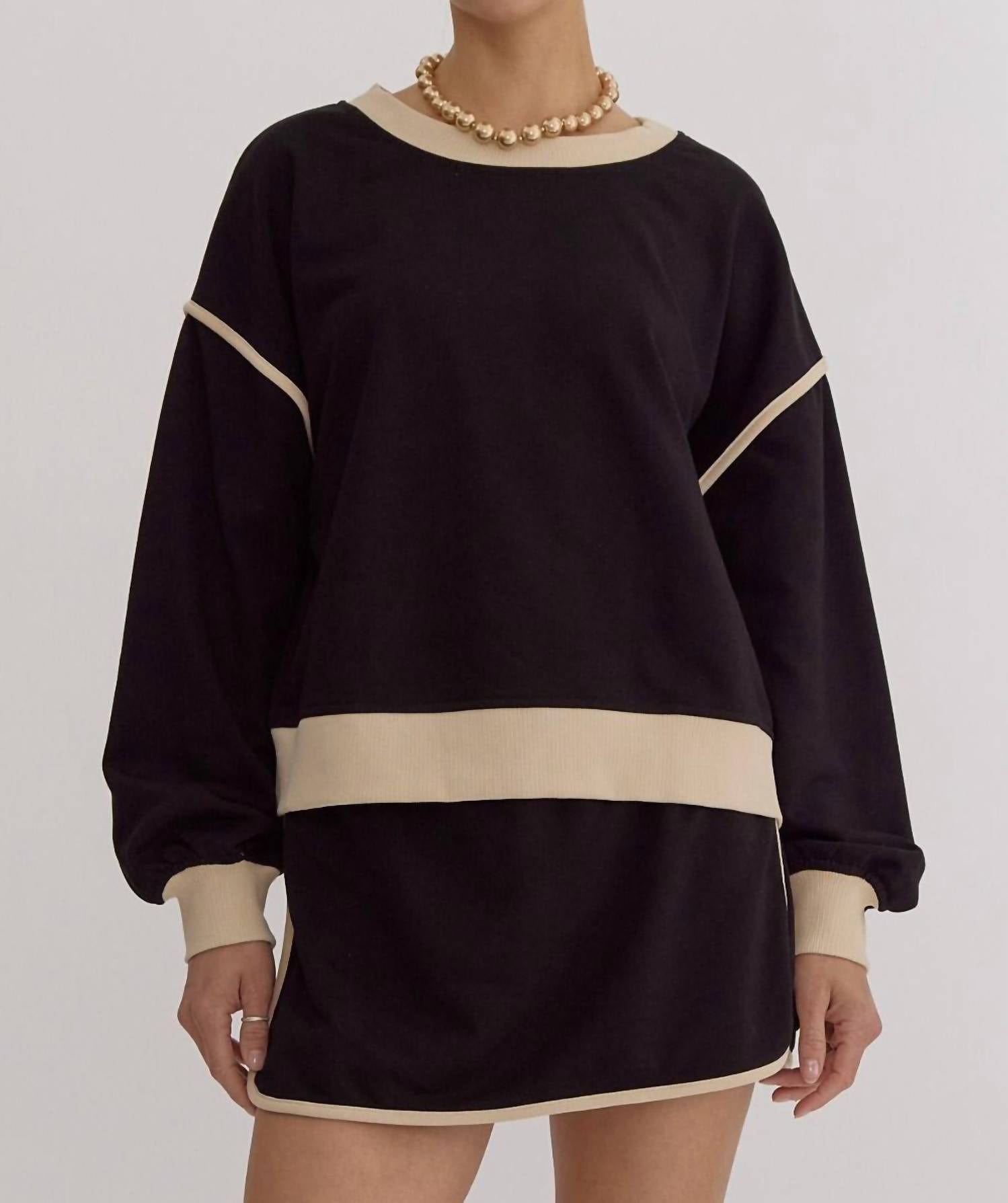 Whether you're running around town or lounging at home, this sweatshirt works for both. Introducing the Entro Solid Contrast Trim Long Sleeve Top, a stylish and textured piece in classic black featuring a crewneck design. Crafted from a cotton blend, this lightweight knit top offers both comfort and style with its long sleeves and contrasting trim. Closure: Pull on. Ideal for casual wear, it adds a touch of elegance to your everyday wardrobe.