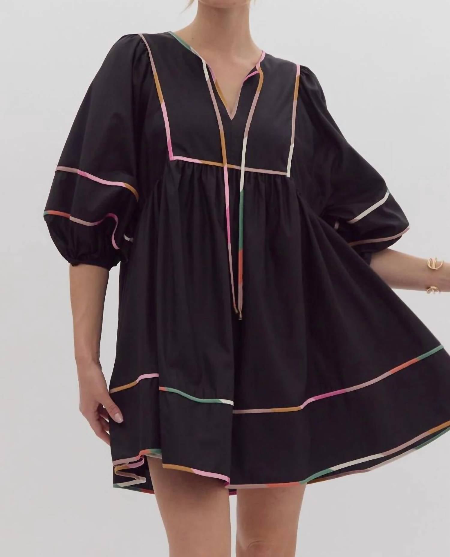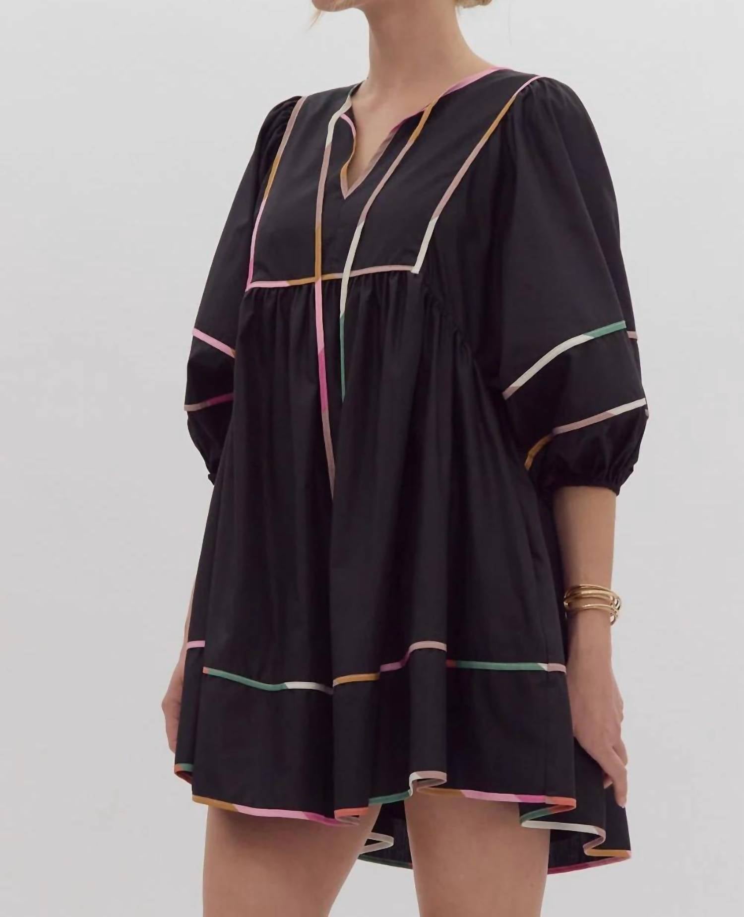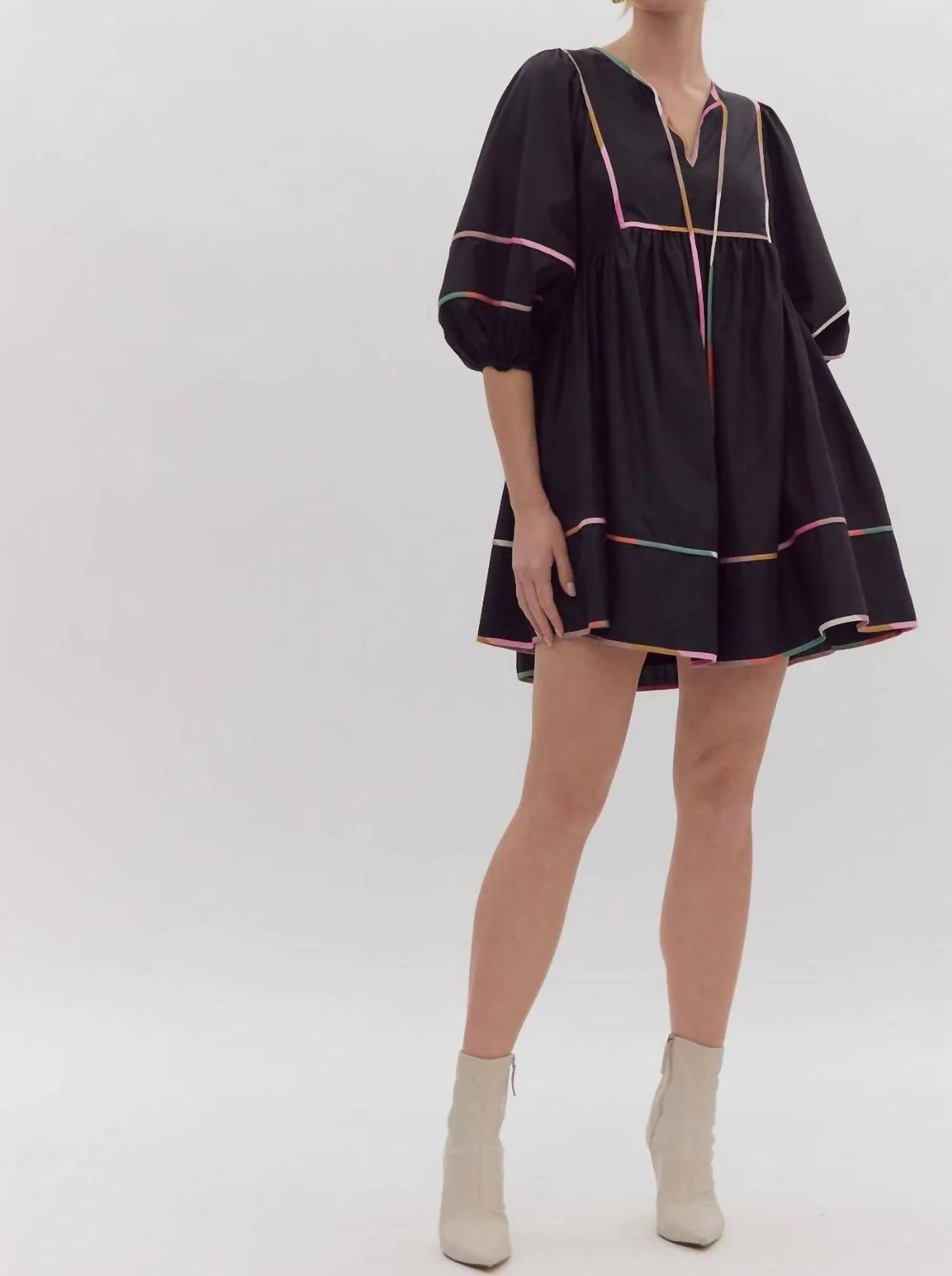 Elevate your vacation wardrobe with the Entro Solid Split V-neck Mini Dress in classic black. This mini dress features a stylish split v-neck and three-quarter elasticated sleeves, enhanced by multicolor binding over the seams. Composition: 80% Polyester, 20% Cotton. Closure: Pull-on style. It comes with convenient side pockets and is lined for added comfort.