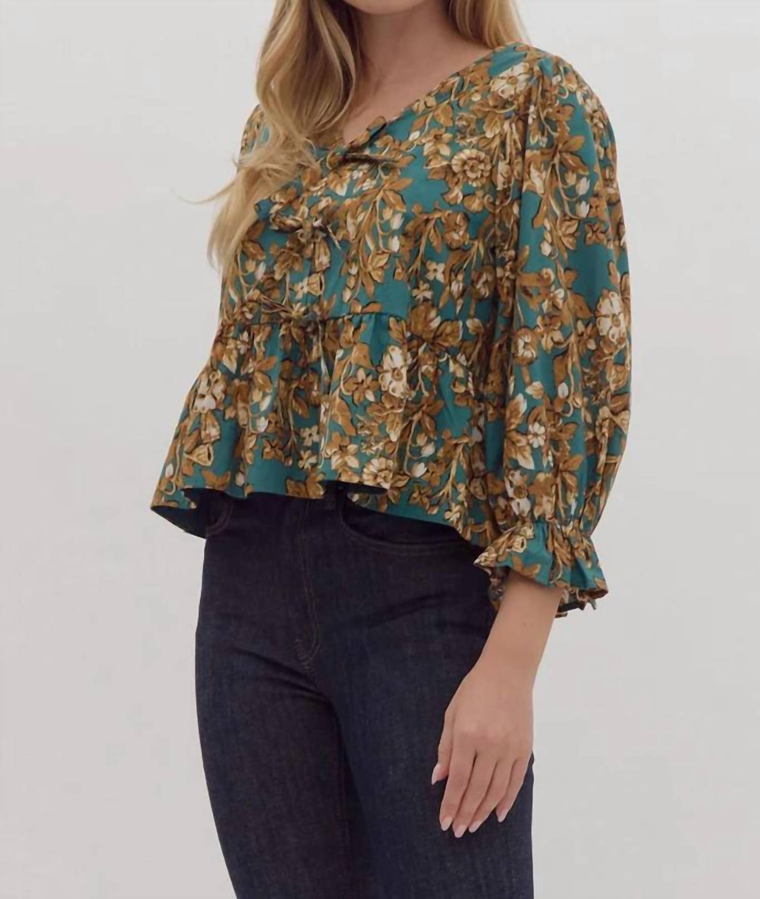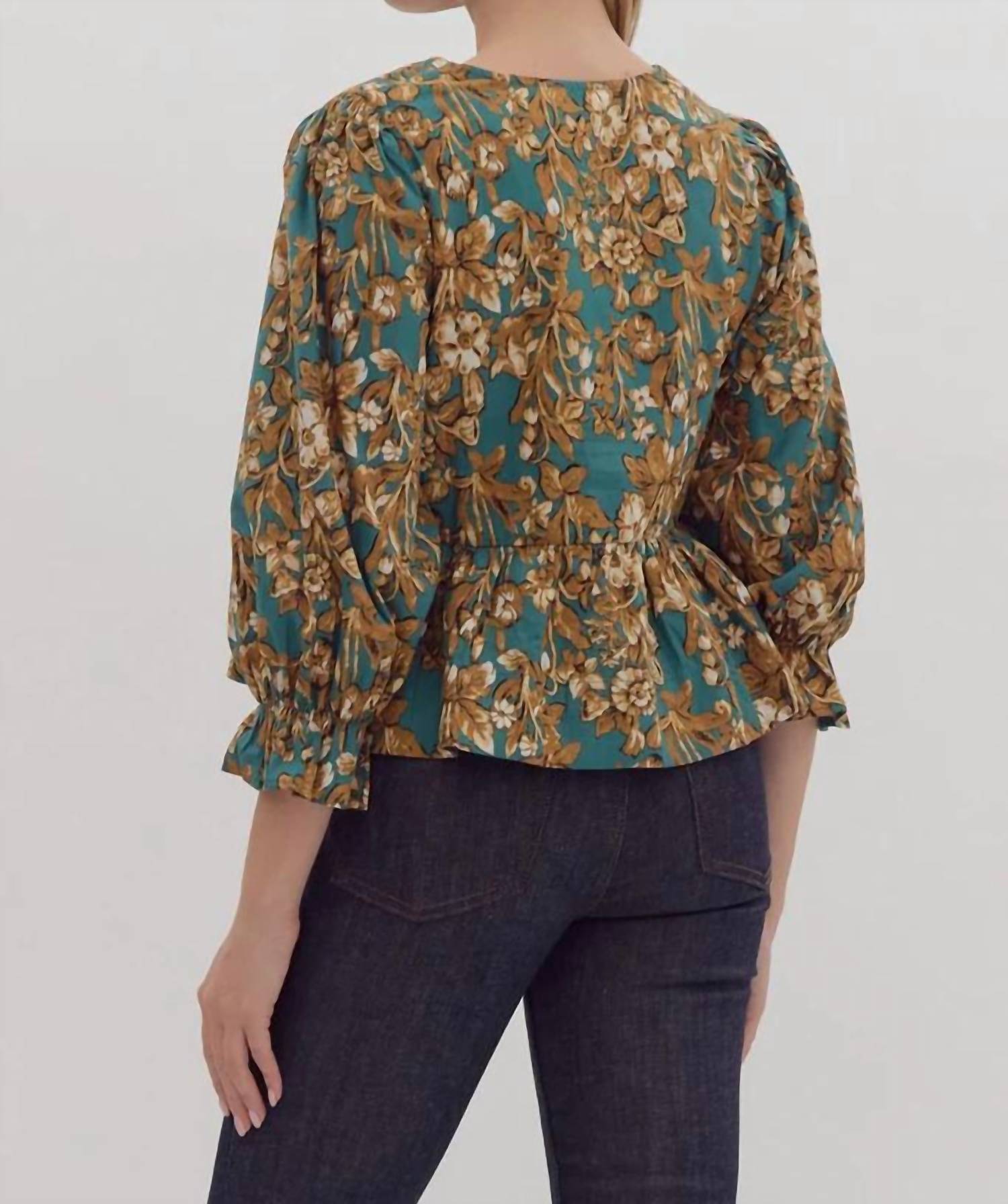A versatile blouse that works from desk to dinner! Perfect for your holiday festivities. Crafted from 100% cotton. Lightweight, non-sheer blouse features a V-neckline and three-quarter elastic sleeves for added comfort. Elegant emerald and gold floral pattern is beautifully accentuated by fixed bows at the front. Tie closure. Hand wash. Ideal for a boho chic look this Thanksgiving.