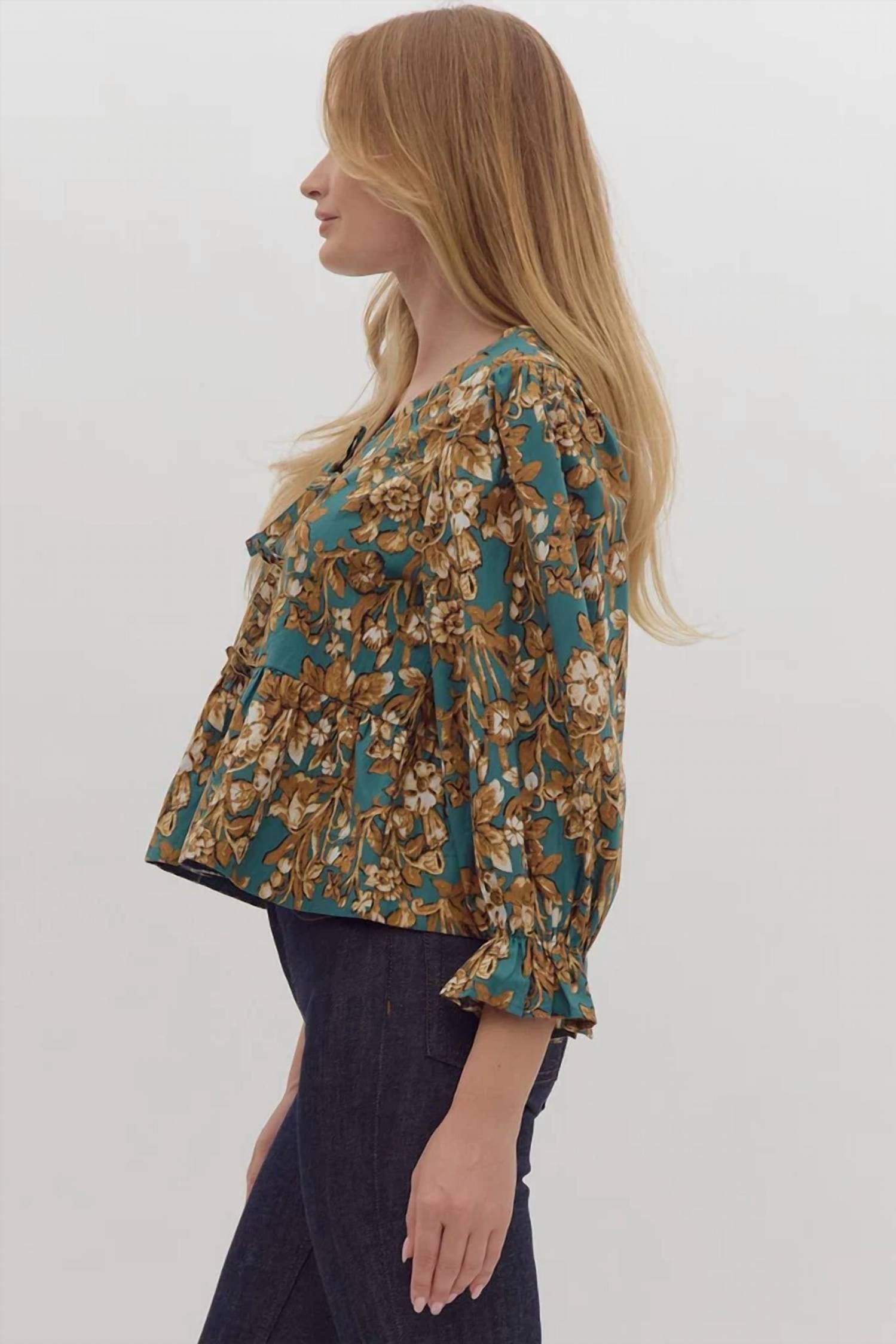 Perfect for your holiday festivities. Crafted from 100% cotton. Lightweight, non-sheer blouse features a V-neckline and three-quarter elastic sleeves for added comfort. Elegant emerald and gold floral pattern is beautifully accentuated by fixed bows at the front. Tie closure. Hand wash. Ideal for a boho chic look this Thanksgiving.
