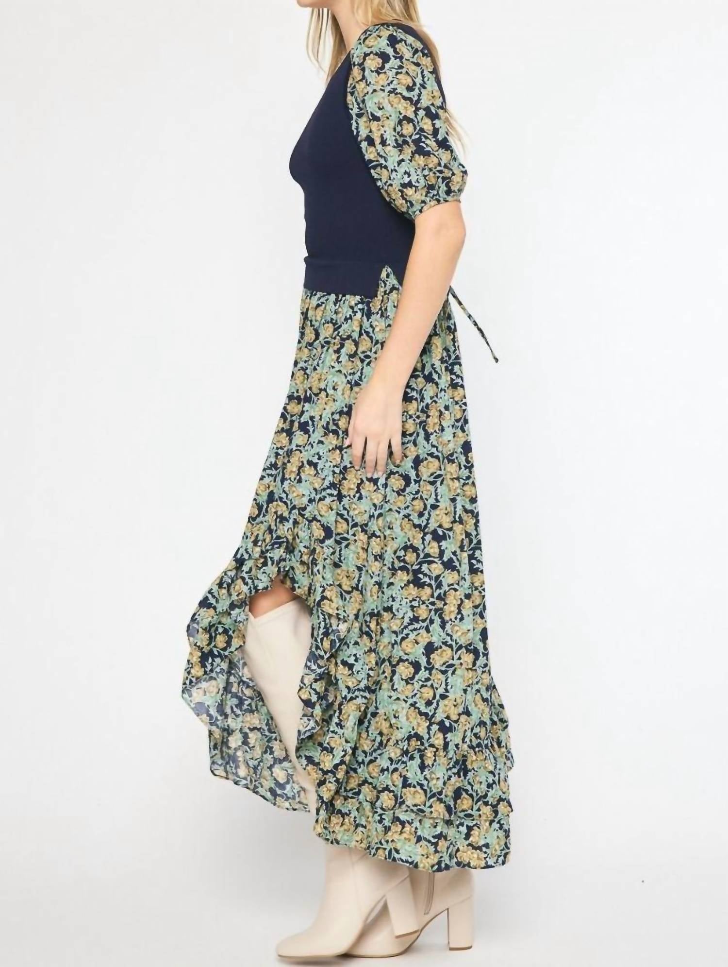 Style this maxi with your favorite statement necklace and sandals for the perfect look.This lightweight floral print maxi dress features a contrasting knit top, half sleeves with adjustable ties, and a ruffle hem. It is lined, non-sheer, and perfect for a breezy, comfortable look.