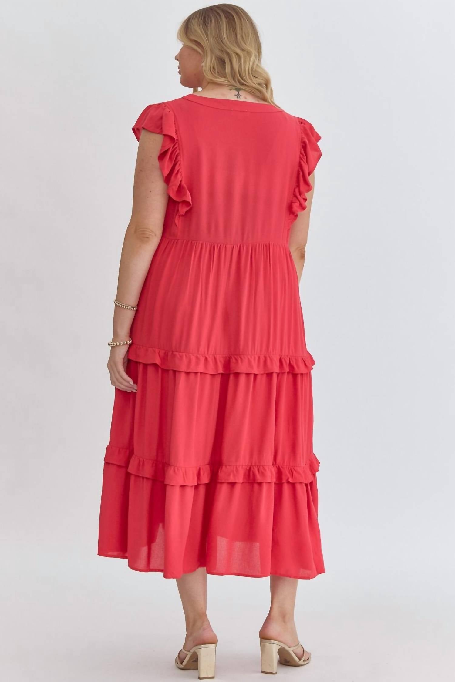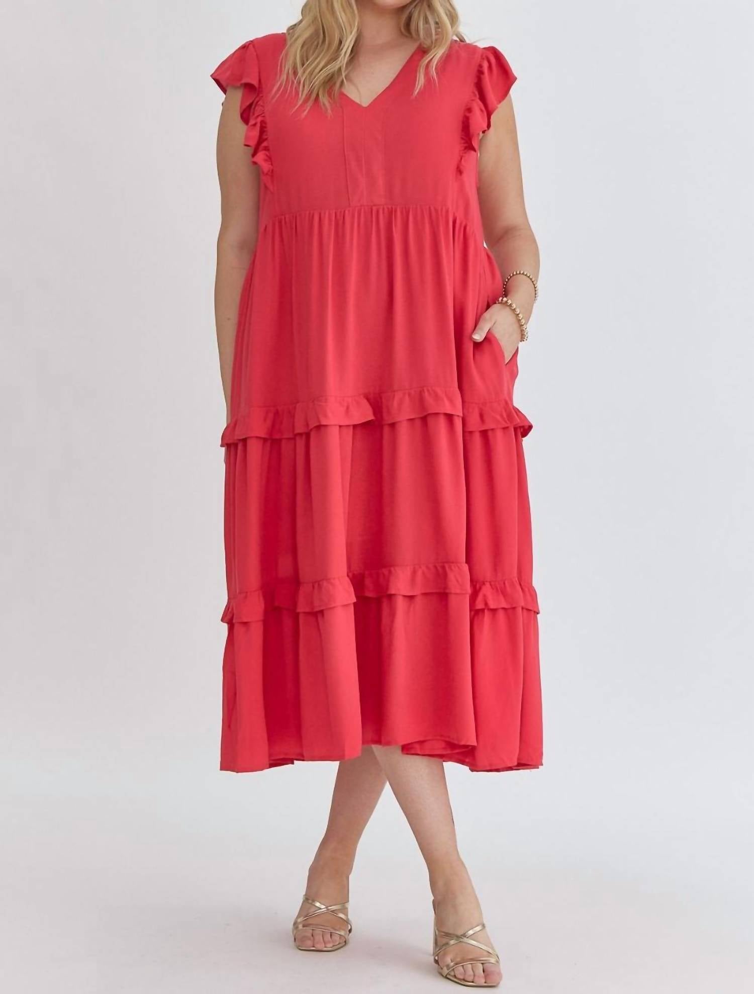 The perfect length dress does exist. Elevate your wardrobe with the You're Mine Dress by Entro, perfect for any occasion. This red midi dress features a flattering V-neckline and a sleeveless design, complete with tiers of delicate ruffles that enhance its feminine A-line silhouette. Convenient side pockets add practicality to its stylish appeal. The mediumweight woven fabric ensures optimal coverage and breathability, with a solid pattern for a timeless look.