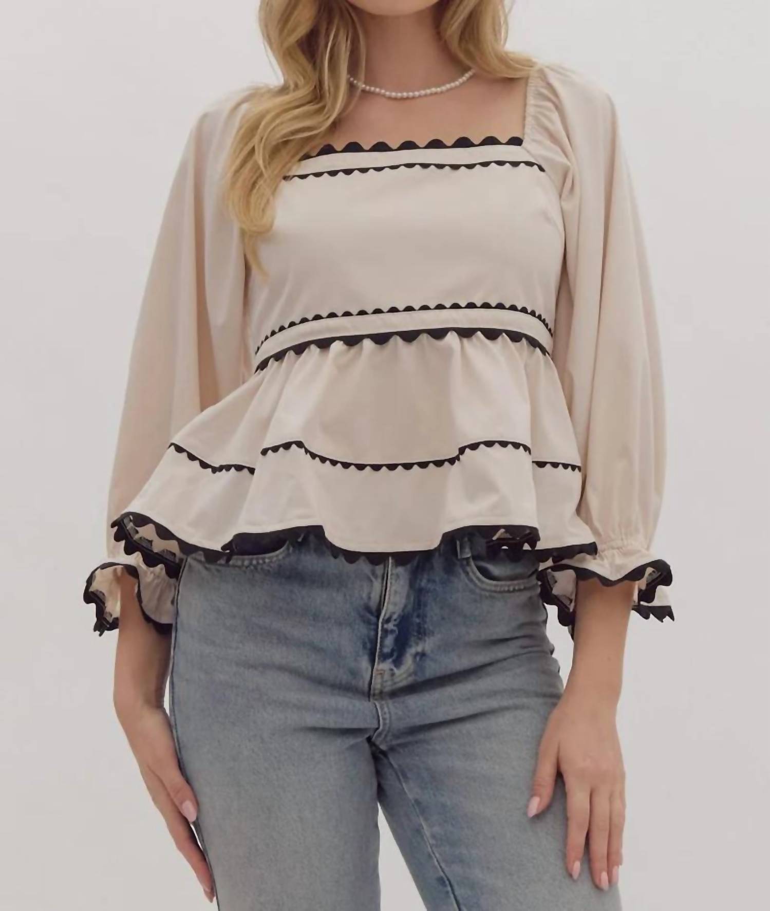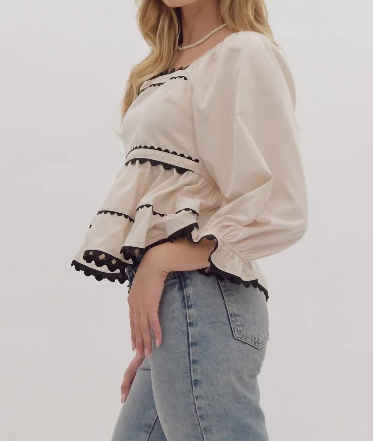 A timeless blouse that will never go out of style. Chic addition to any dinner party ensemble. Cream blouse features long sleeves, a fashionable square neckline, and a playful babydoll peplum silhouette with ric rac trim. Made from a blend of 77% Polyester, 20% Modal, and 3% Spandex, ensures a lightweight and comfortable fit. Pull on. Care instructions include hand washing for longevity.