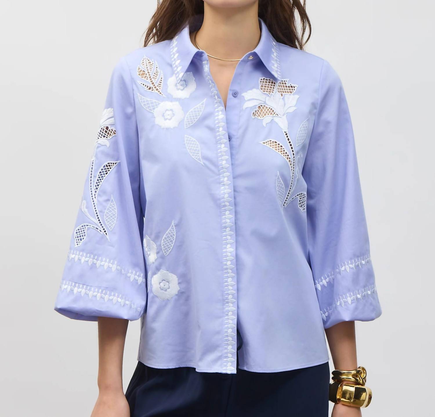 Pair this with your favorite jeans and slides for your next girls night out. Introducing the Elaine Top by FIGUE in a stunning Lotus Blue, perfect for elevating your wardrobe. This women's blouse features elegant three-quarter blouson sleeves with interior elastic and showcases intricate embroidery and cutwork detailing throughout. Made from 100% Cotton Poplin, this top offers both comfort and luxury with a button front closure and an embroidered front placket. The length from the highest point to hem is 25 inches, and it is imported. Care: Dry clean only.