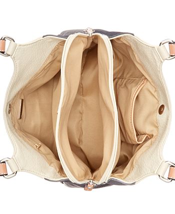 Small sized bag; 11-1/2W x 10H x 3-1/2D (width is measured across the bottom of handbag)|10L handles|Zip closure|Silver-tone exterior hardware| 1 front zip pocket & 1 back zip pocket|1 interior center zip compartment & 2 snap pockets with 1 zip pocket & 1 slip pocket
