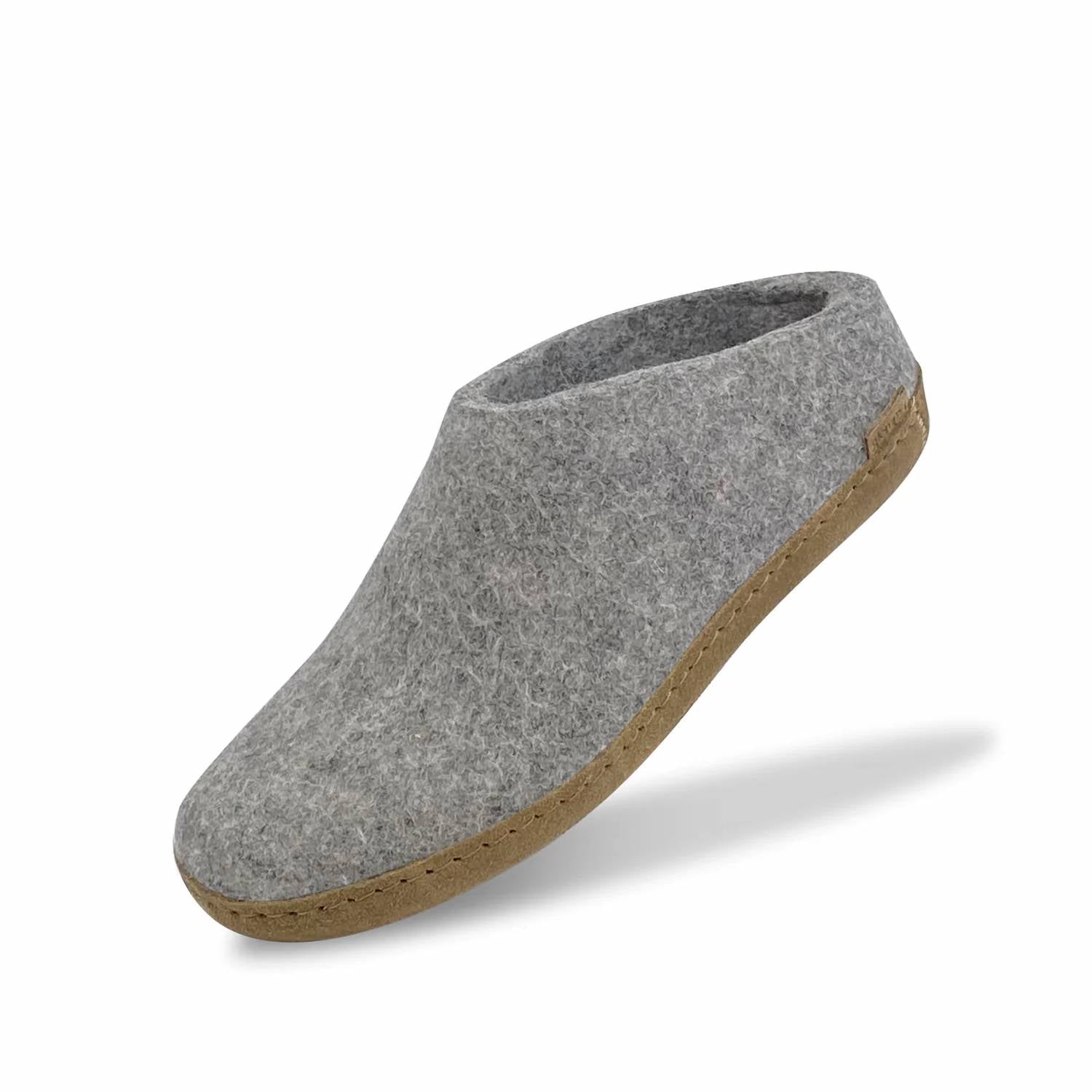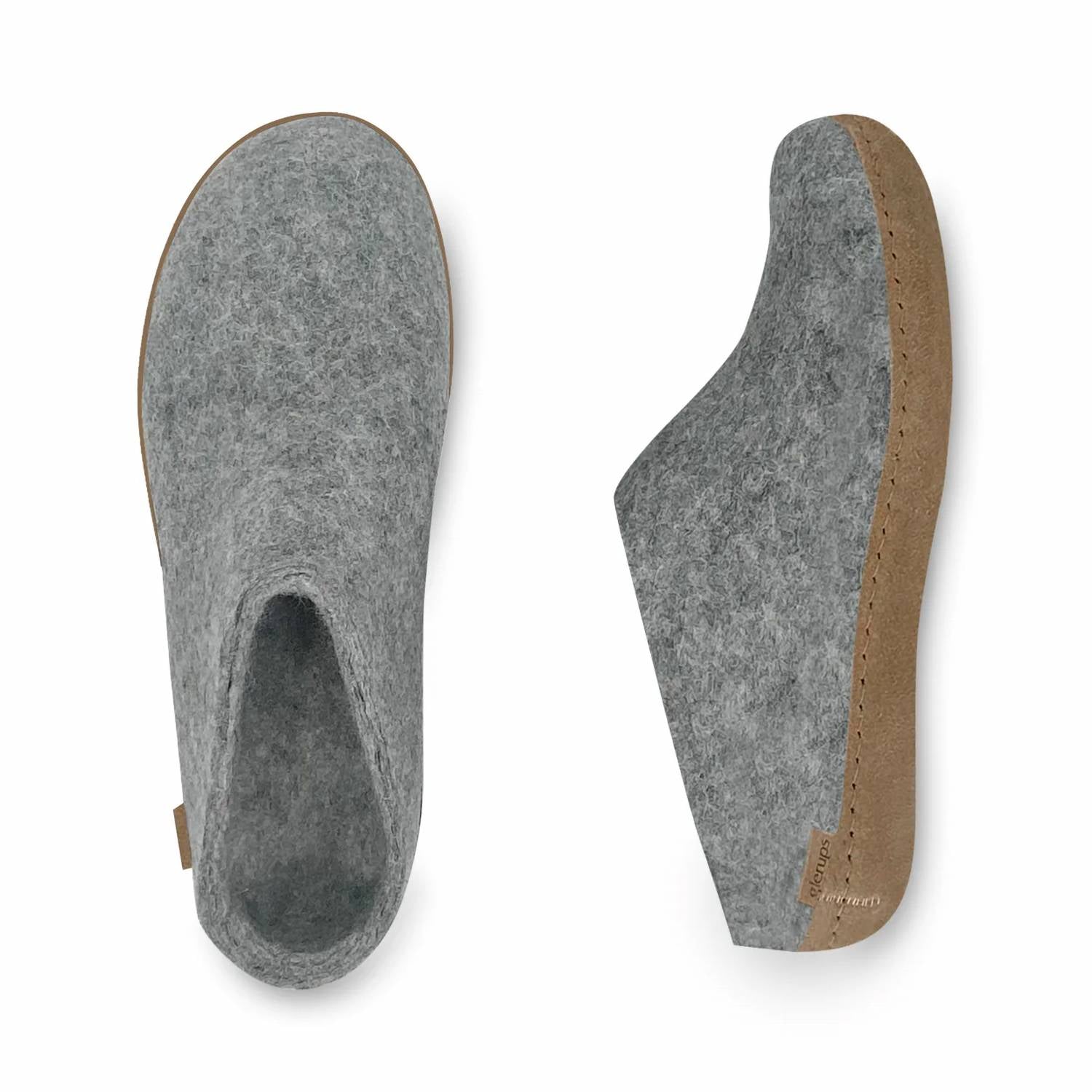 Slip into these, we promise you won't regret it. Introducing the Unisex Slip-on With Leather Sole Slippers by Glerups, crafted from 100% pure natural wool for ultimate comfort and sustainability. Adorned in a classic grey color, these slippers feature a soft, chrome-free calfskin sole, ensuring a luxurious and itch-free experience. Designed with a convenient slip-on style for ease of wear, they boast a flat round toe and heel silhouette perfect for pampering tired feet. Glerups takes pride in ethically producing each pair in their own factory, respecting animals, people, and nature.