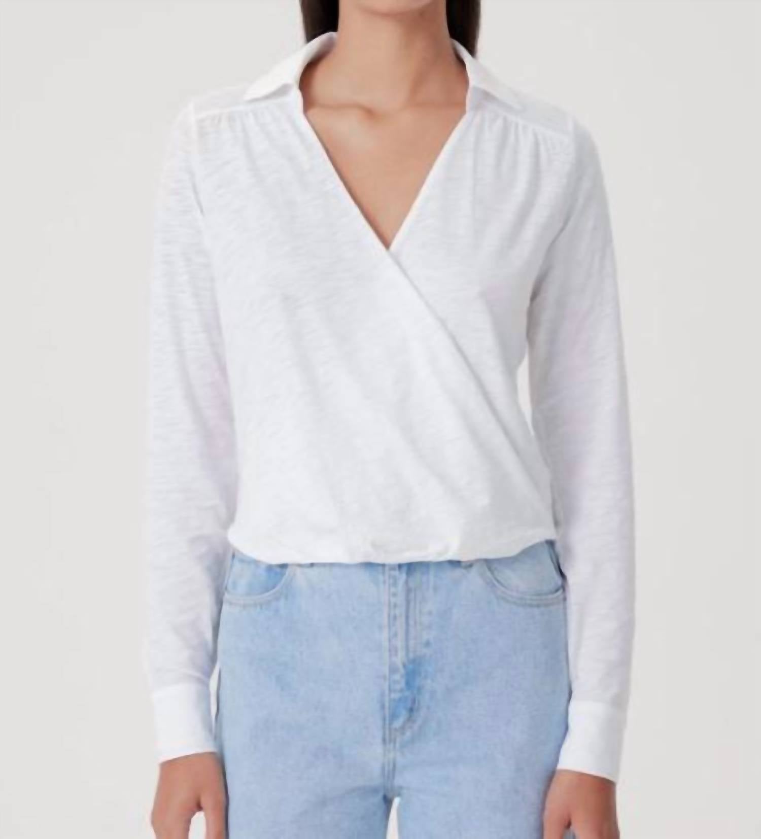 A long sleeve top you can wear with denim, skirts, well... just about anything! Easy to love: a long-sleeve surplice top with a beautiful drape. Cuffs with fabric-covered buttons and a classic collar complete the look. 100% Peruvian pima cotton Signature slub jersey with a light, silky texture Made in Peru Body length: 20” front, 22” back Machine wash