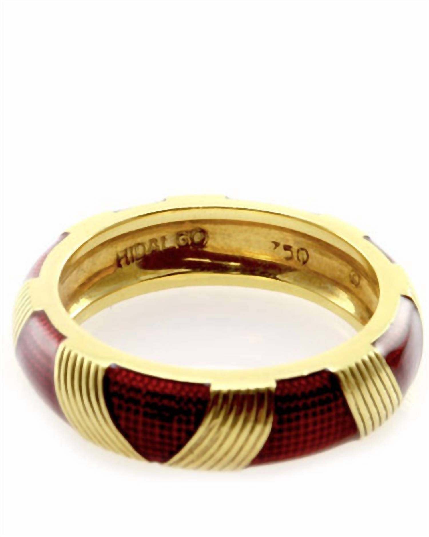 This ring will be your favorite go-to piece of the season. Enhance your collection with the Women's Enamel Ring by Hidalgo, crafted in luxurious 18k Yellow Gold. This fashion ring features a vibrant red hue and weighs 7.9 grams, offering both elegance and substance. It's designed in a size 6.25, ensuring a perfect fit for your stylish ensemble. For sizing adjustments, please contact the store for details.
