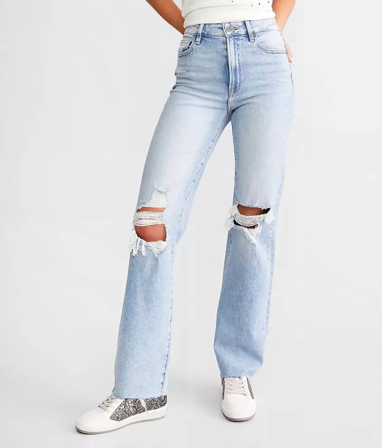 This classic straight leg jean has a perfect fit and goes with just about everything. The HIDDEN Ella Straight Stretch Jean offers a timeless streetwear style ideal for summer with its light wash textured cotton blend. Featuring an ultra high rise and a straight leg silhouette, these jeans are slightly eased through the hip and thigh with a 16" bottom opening, complemented by subtle destruction details for a lived-in feel. The button closure ensures a secure fit, and these imported jeans are crafted to provide the comfort of well-worn denim. Easy to maintain, simply machine wash cold and tumble dry low; model wears size 24x31 (5'7" height, 30.5" bust, 23" waist, 35" hip).