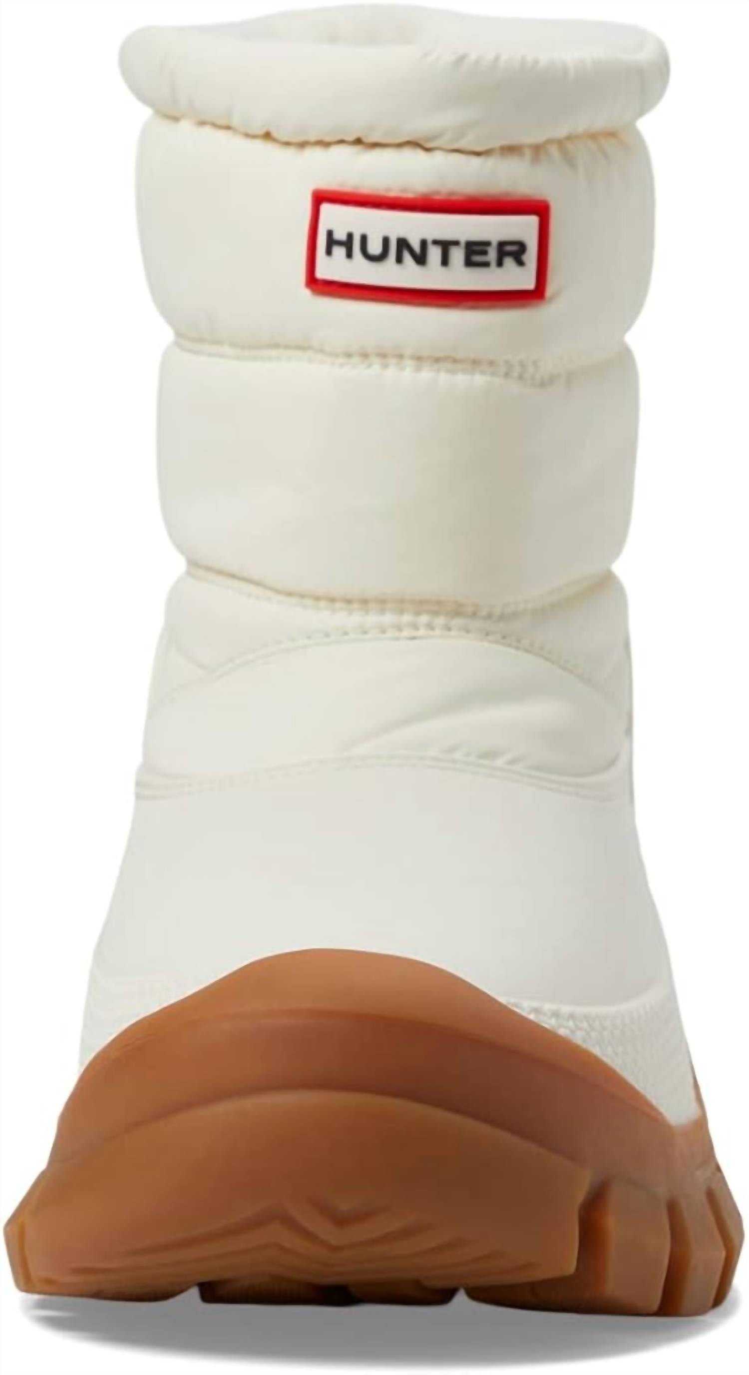 Step into warmth and style with the HUNTER Women's Intrepid Short Snow Boots in White Willow/Gum. These ankle-length boots are designed with a round toe and reinforced toe cap for enduring comfort and protection. Crafted from a smooth textile and synthetic upper, they feature a breathable textile lining and a removable insole, all set on a non-slip synthetic outsole with a low chunky heel for secure footing on icy surfaces. The easy bungee cinch closure at the back ensures a snug fit, making them an ideal choice for everyday winter wear.