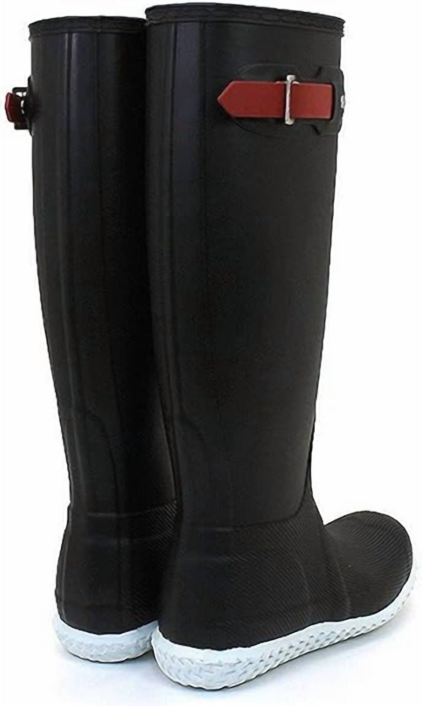 Rainy day? No problem! The cutest and most comfortable rainboots of the season. Stay stylish yet practical with the Women's Original Flat Heel Calendar Sole Tall Rain Boots by HUNTER. Crafted in durable rubber, these black and Hunter red boots are designed to keep your feet dry during rainy seasons. Featuring a classic round toe and flat heel style, they ensure comfort and support for all-day wear. Ideal for adult women, these boots blend functionality with timeless style, making them a must-have for your wet weather wardrobe.