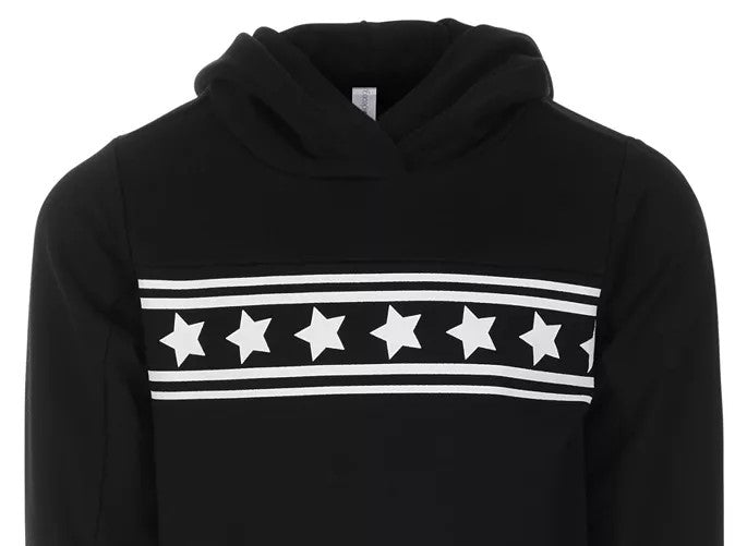 Hooded|Striped ribbed cuffs at long sleeves|Graphic print at front|Kangaroo pocket at front|Ribbed hem|Cotton/polyester