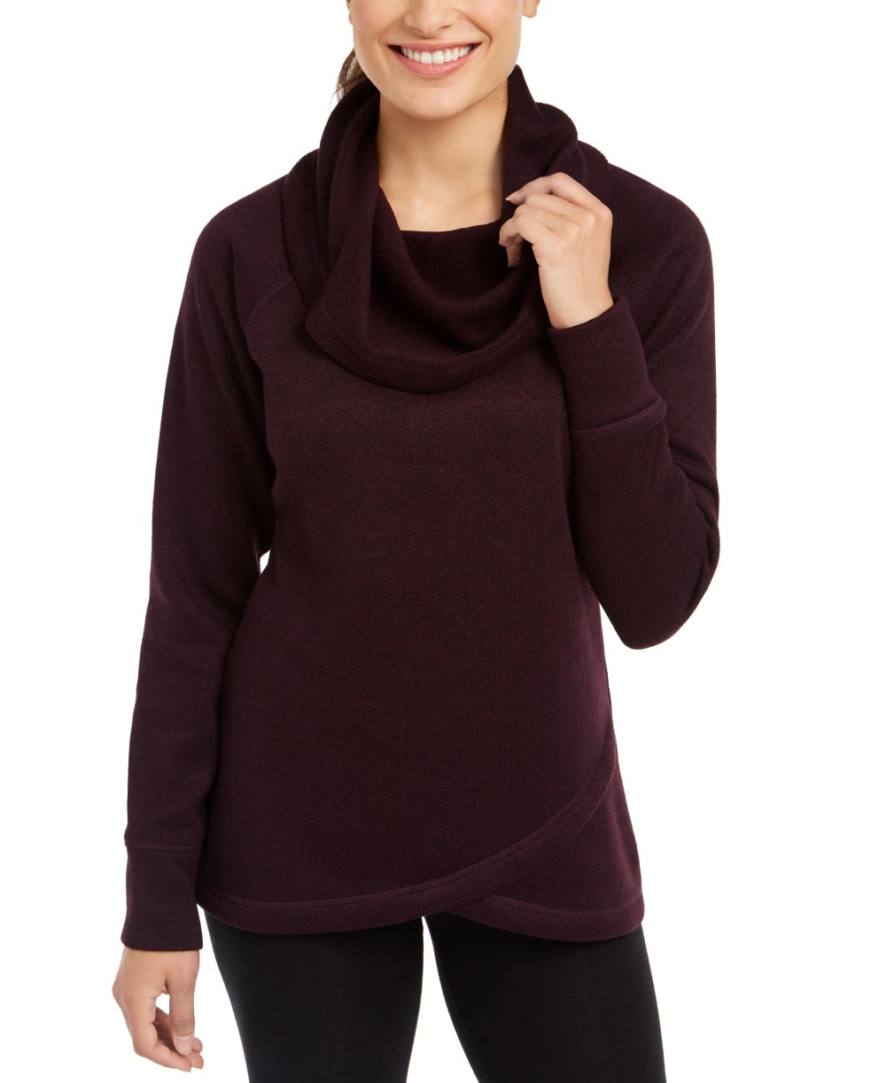 Semi-fitted|Cowl neckline and drawstring; cross-over hem|Hits at hip|Polyester