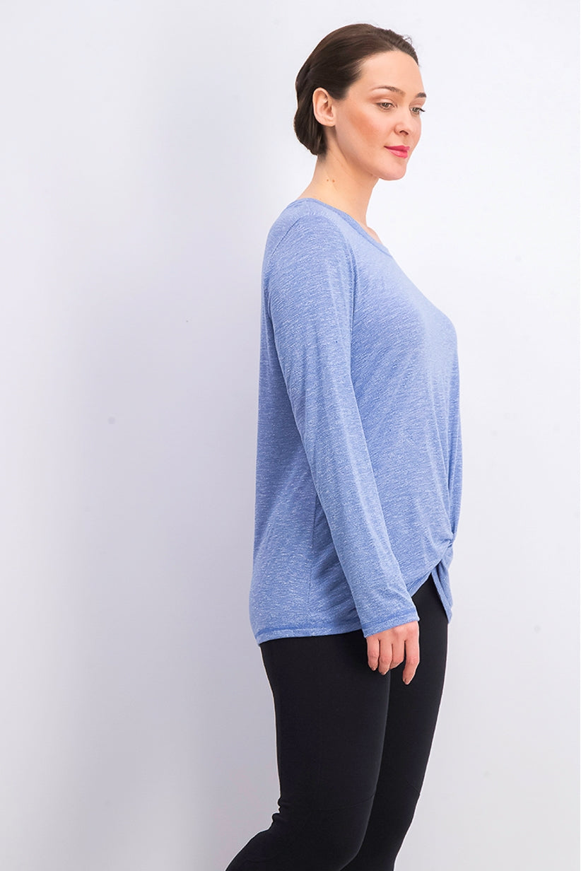 Hits at hip with knotted detail at hem|INSPIRED FOR: Athleisure|Crewneck|Polyester/rayon/spandex|Machine washable