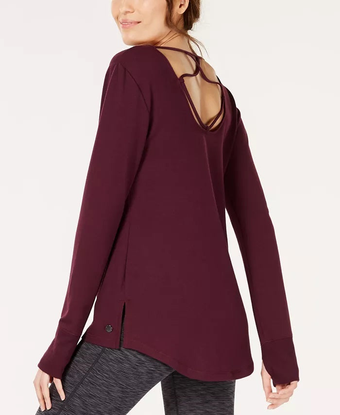 Hits at hip; semi-fitted|INSPIRED FOR: Yoga|Lattice back; long sleeves with thumbholes|Polyester/rayon/spandex|Machine washable