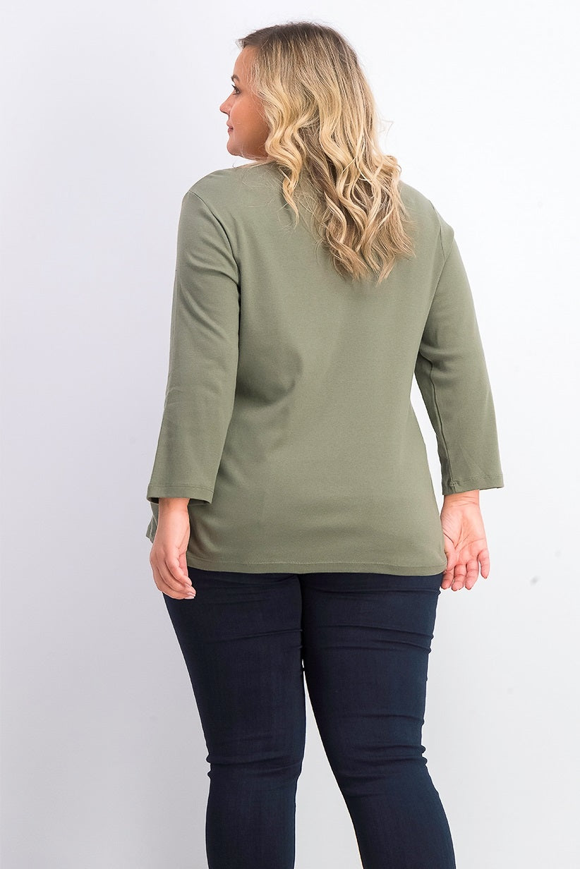 Approx. model height is 5'10" and she is wearing size 1X|Relaxed fit; approx. 28" long|Scoop neckline|Sequined flowers at chest|3/4-sleeves|All cotton