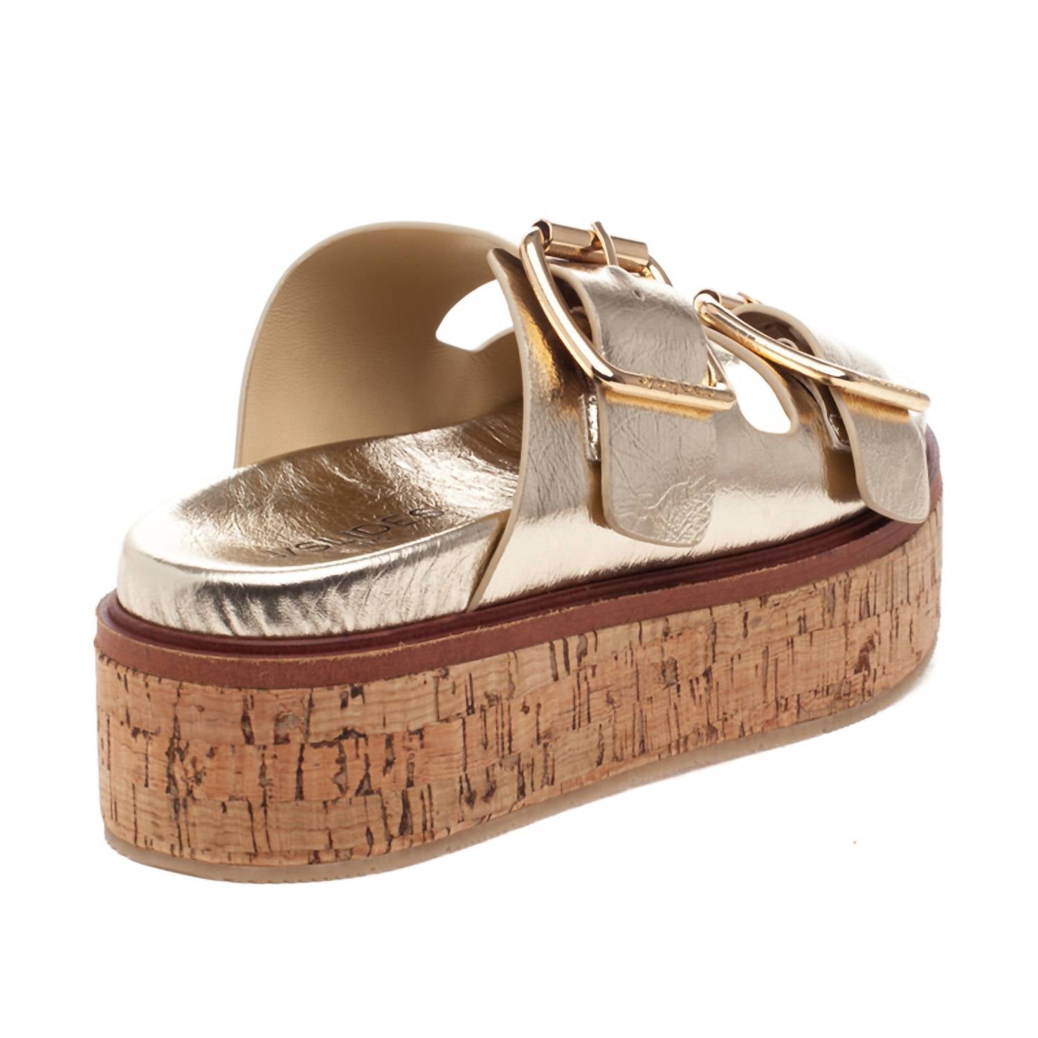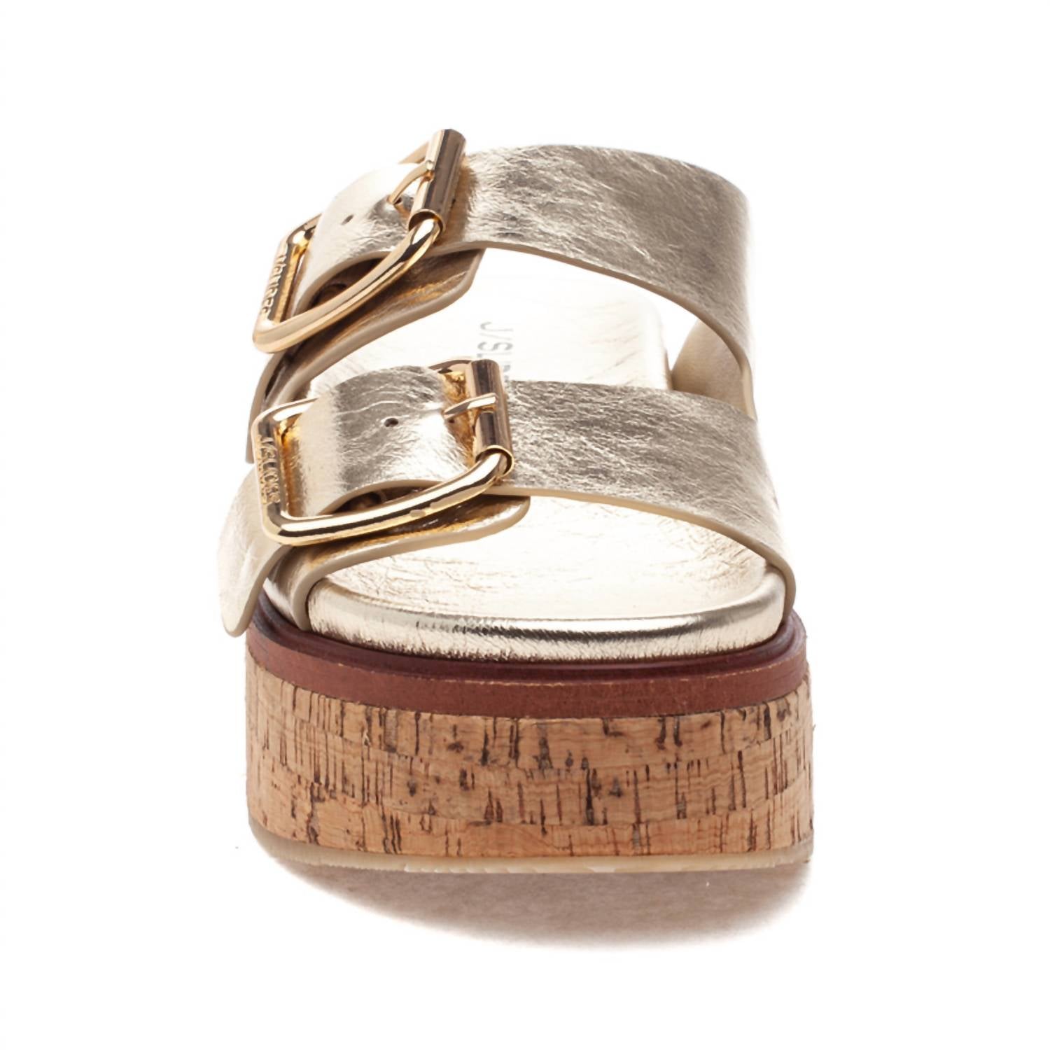 The perfect variation on one of our favorite trends this season. Step into style with the Women's Belinda Platform Sandal by J/SLIDES, radiating in a lustrous gold hue. These sandals feature a leather upper and lining, combined with a comfortable cushioned footbed, ensuring all-day wearability. With a natural cork platform standing at approximately 1.5", these sandals provide both lift and comfort. Equipped with adjustable buckles, they promise a secure fit and are perfect for any casual outing.