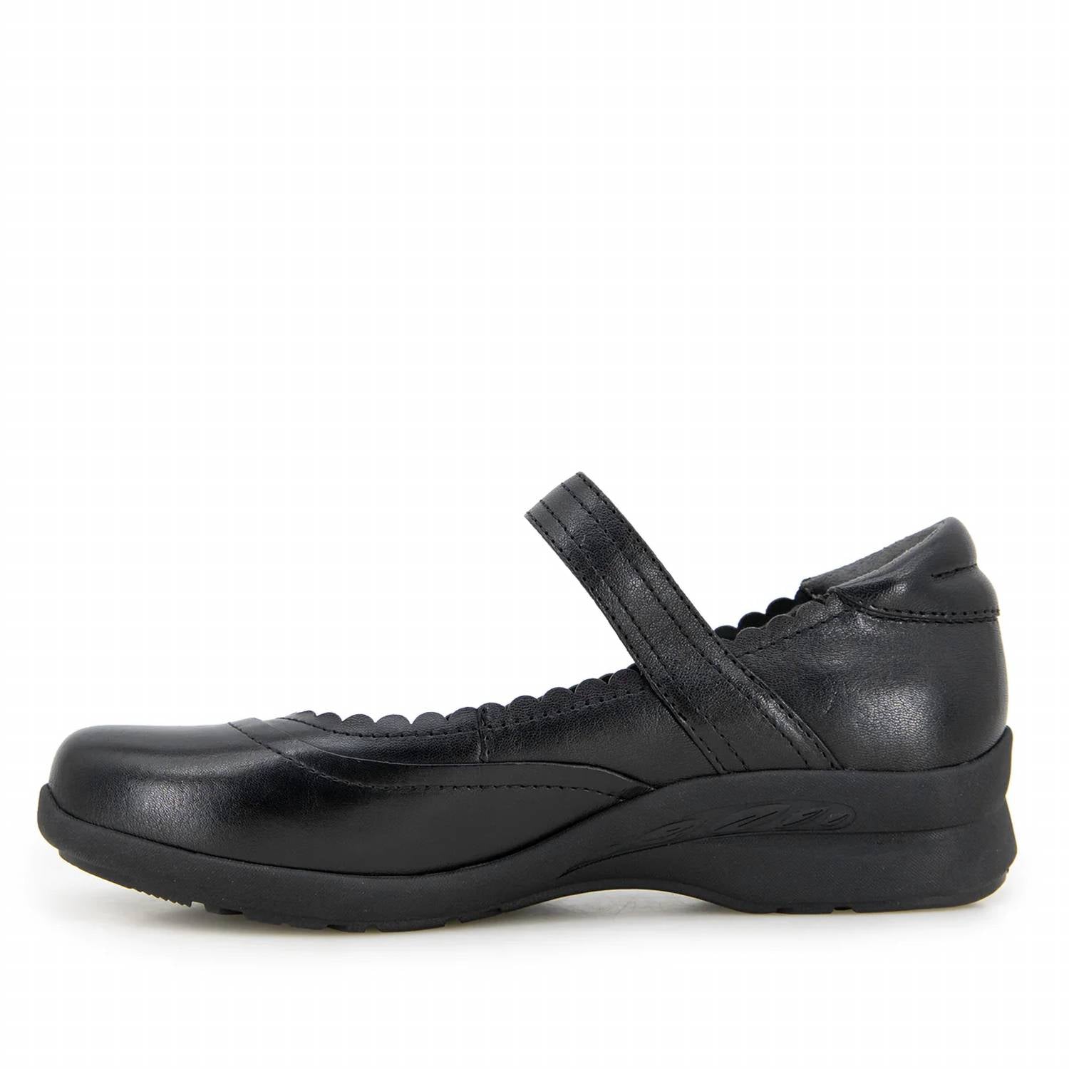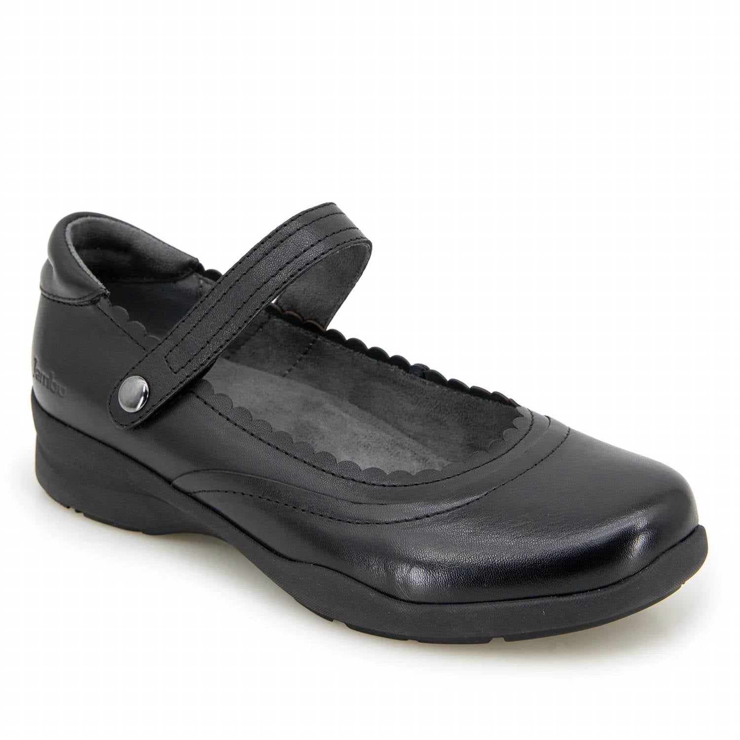 Perfect blend of style and comfort designed for the modern woman. Made from premium leather material. Enhanced by a charming scalloped edge and a round toe shape. Flexible rubber outsole and removable contoured insoles ensure all-day comfort. Hook and loop closure concealed under a decorative button-like stud provides adjustable sizing ease. APMA accepted for optimal foot support.